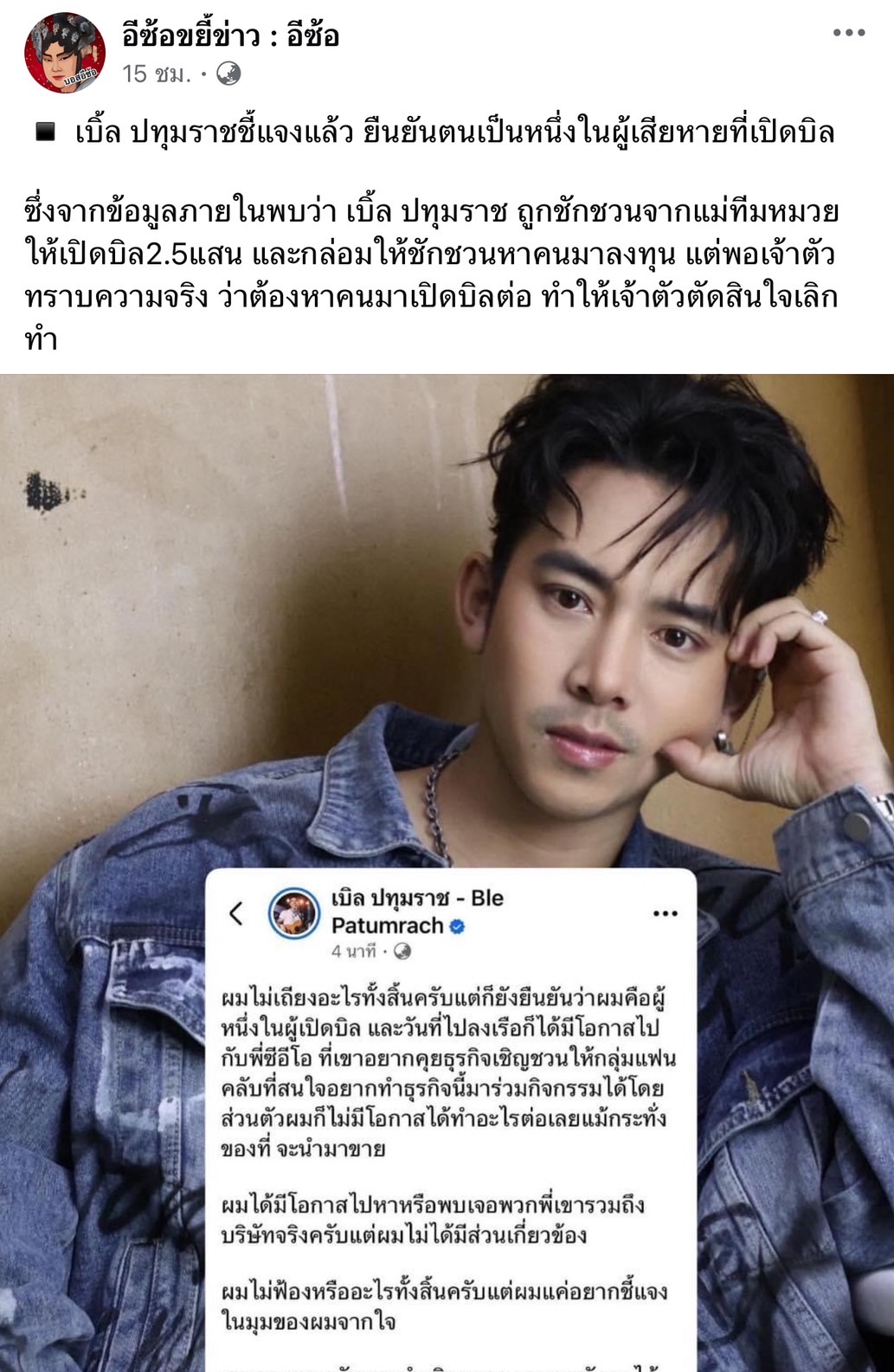 ต่อมาทางเพจดังก็ได้ออกมาแชร์โพสต์ที่หนุ่มเบิ้ลได้ชี้แจงพร้อมแคปชั่นว่า “เบิ้ล ปทุมราชชี้แจงแล้ว ยืนยันตนเป็นหนึ่งในผู้เสียหายที่เปิดบิล