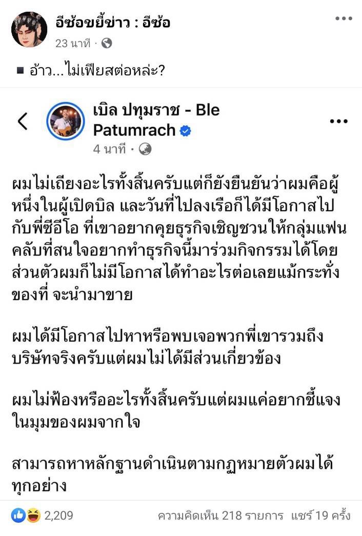 ต่อมา “เบิ้ล ปทุมราช” ก็ออกมาชี้แจงโดยโพสต์ข้อความว่า “ผมไม่เถียงอะไรทั้งสิ้นครับ แต่ก็ยังยืนยันว่า ผมคือหนึ่งในผู้เปิดบิล และวันที่ไปลงเรือก็ได้มีโอกาสไปกับพี่ซีอีโอ ที่เขาอยากคุยธุรกิจเชิญชวนให้กลุ่มแฟนคลับที่สนใจอยากทำธุรกิจนี้มาร่วมกิจกรรมได้โดยส่วนตัว ผมก็ไม่มีโอกาสได้ทำอะไรต่อเลย แม้กระทั่งของที่จะนำมาขาย ผมได้มีโอกาสไปหารือพบเจอพวกพี่เขา รวมถึงบริษัทจริงครับ แต่ผมไม่ได้มีส่วนเกี่ยวข้อง ผมไม่ฟ้องหรืออะไรทั้งสิ้นครับ แต่ผมแค่อยากชี้แจงในมุมของผมจากใจ สามารถหาหลักฐานดำเนินการตัวผมได้ทุกอย่าง” แต่ล่าสุด ทางด้านหนุ่มเบิ้ล ประทุมราช ได้ลบโพสต์ดังกล่าวออกไปแล้ว