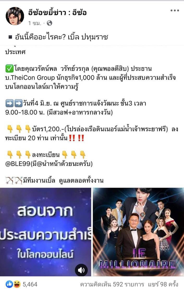 อ้าวแล้ว กลับมาเป็นประเด็น เมื่อเพจดัง ได้ออกมาปาโพสต์ของนักร้องหนุ่ม “เบิ้ล ปทุมราช” ที่เคยโพสต์เมื่อวันที่ 2 มิ.ย. 2565 โดยมีข้อความชักชวนร่วมฟังบรรยายธุรกิจออนไลน์ บริษัทดิไอคอน โดยมีบอสพอล มาให้ความรู้ บัตรราคา 1,200 บาท พร้อมโปรล่องเรือดินเนอร์ แม่น้ำเจ้าพระยาฟรี มีทีมงานเบิ้ล ดูแลตลอดทั้งงาน”