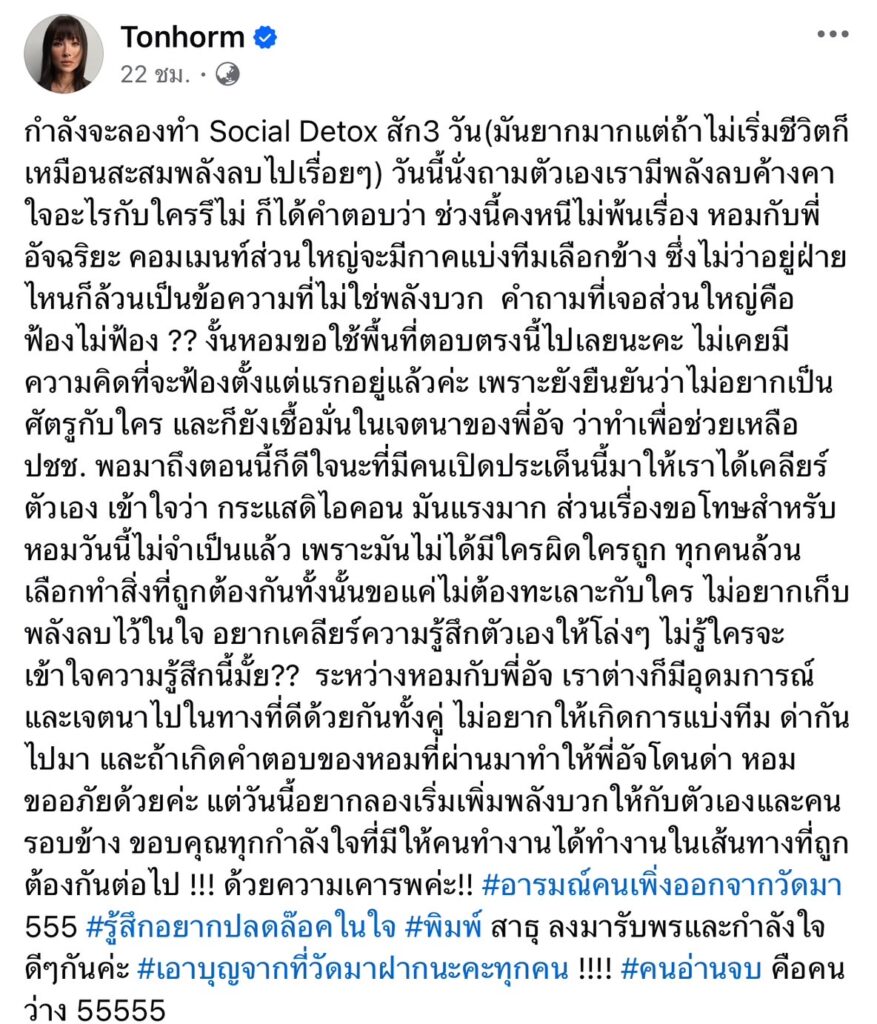 “ระหว่างหอมกับพี่อัจ เราต่างก็มีอุดมการณ์และเจตนาไปในทางที่ดีด้วยกันทั้งคู่ ไม่อยากให้เกิดการแบ่งทีม ด่ากันไปมา และถ้าเกิดคำตอบของหอมที่ผ่านมาทำให้พี่อัจโดนด่า หอมขออภัยด้วยค่ะ แต่วันนี้อยากลองเริ่มเพิ่มพลังบวกให้กับตัวเองและคนรอบข้าง ขอบคุณทุกกำลังใจที่มีให้คนทำงานได้ทำงานในเส้นทางที่ถูกต้องกันต่อไป !!! ด้วยความเคารพค่ะ!! #อารมณ์คนเพิ่งออกจากวัดมา 555 #รู้สึกอยากปลดล๊อคในใจ #พิมพ์ สาธุ ลงมารับพรและกำลังใจดี ๆ กันค่ะ #เอาบุญจากที่วัดมาฝากนะคะทุกคน !!!! #คนอ่านจบคือคนว่าง 55555”