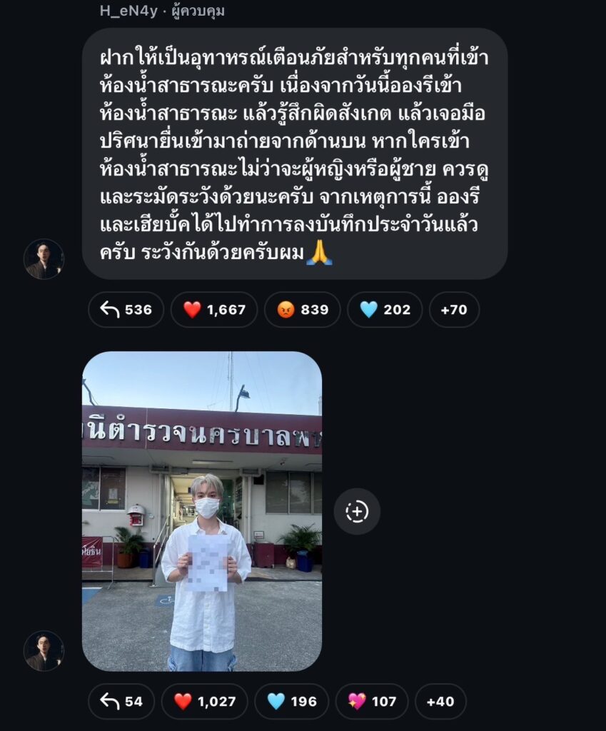 “ฝากให้เป็นอุทาหรณ์เตือนภัยสำหรับทุกคนที่เข้าห้องน้ำสาธารณะครับ เนื่องจากวันนี้อองรีเข้าห้องน้ำสาธารณะ แล้วรู้สึกผิดสังเกต แล้วเจอมือปริศนายื่นเข้ามาถ่ายจากด้านบน หากใครเข้าห้องน้ำสาธารณะไม่ว่าจะผู้หญิงหรือผู้ชาย ควรดูและระมัดระวังด้วยนะครับ จากเหตุการนี้ อองรีและเฮียบั้คได้ไปทำการลงบันทึกประจำวันแล้วครับ ระวังกันด้วยครับผม🙏