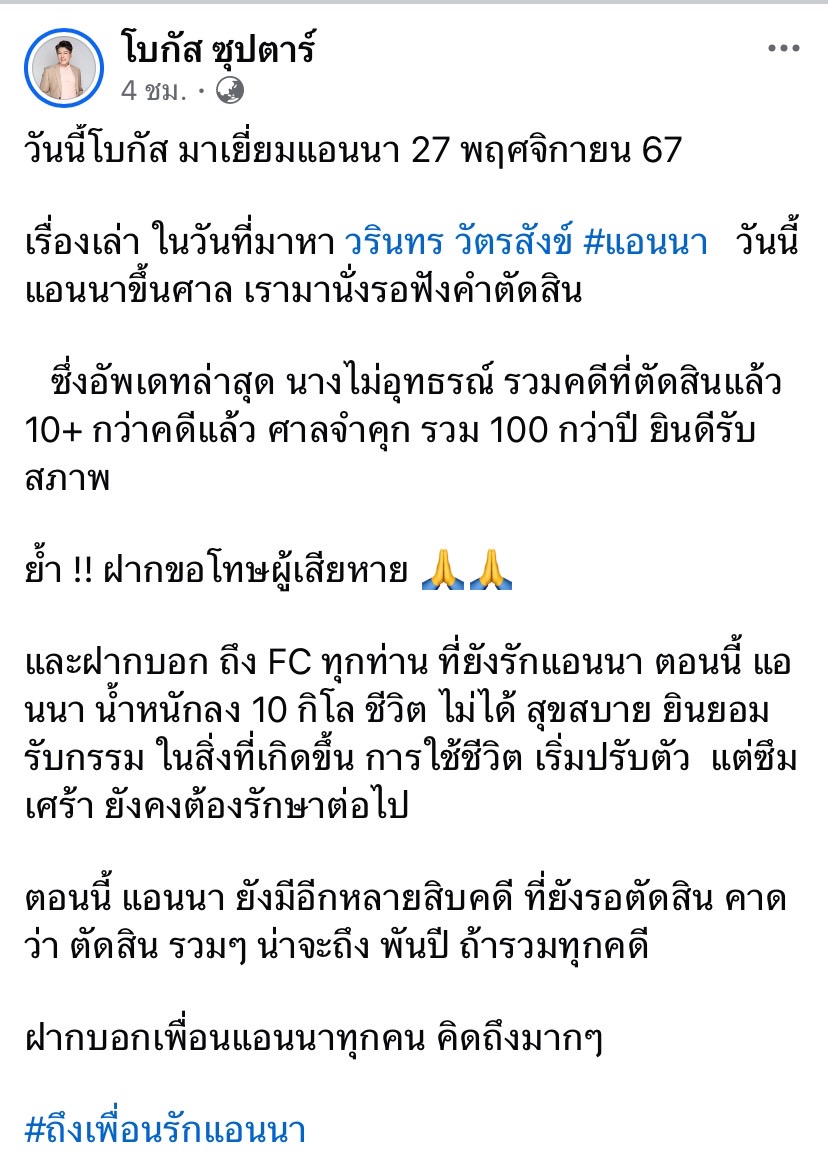 และวันนี้ 27 พฤศจิกายน “โบกัส” เพื่อนคนสนิทของแอนนาก็ได้เดินทางมาฟังคำตัดสินของศาลพร้อมกับอัปเดตความเคลื่อนไหวของ “แอนนา ทีวีพูล” โดนทาง “โบกัส” ได้เปิดโพสต์ข้อความว่า “วันนี้โบกัส มาเยี่ยมแอนนา 27 พฤศจิกายน 67