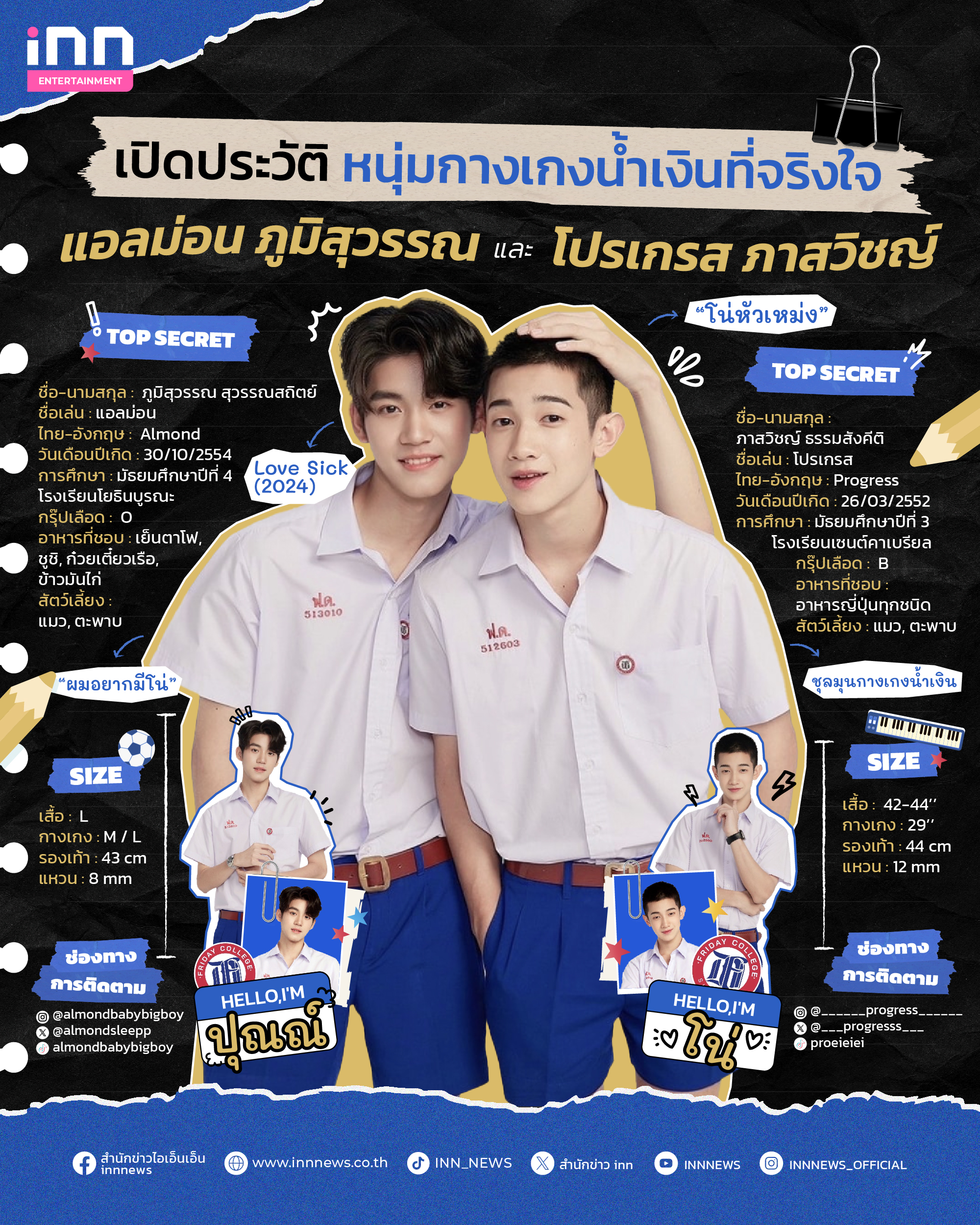 เป็นไงกันบ้างคะสำหรับประวัติของสองหนุ่มกางเกงน้ำเงินจาก Love Sick (2024) ชุลมุนกางเกงน้ำเงิน เชื่อว่าหลายๆคนถ้าได้อ่านบทความนี้แล้ว ต้องสัมผัสถึงความน่ารักน่าเอ็นดูของทั้งสองได้แน่นอน ซึ่งซีรีส์ของทั้งสองตอนนี้เดินทางมาใกล้จะถึงไฟนอลอีพีแล้ว บอกเลยว่าตอนนี้ผู้เขียนอดใจรอแทบไม่ไหวเลยล่ะ สำหรับใครที่อยากติดตามข่าวสารหรือซัพพอร์ตน้องๆ สามารถติดตามได้ทางช่องทางด้านบนนี้ได้เลยค่ะ และครั้งหน้า INN News จะพาทุกคนไปรู้จักกับใคร ฝากติดตามกันด้วยนะคะ (: