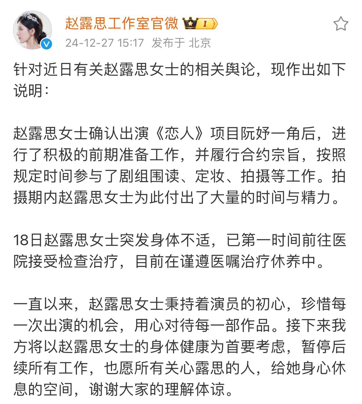 - เมื่อวันที่ 1 มกราคม 2568 ได้มีการแชร์ภาพถ่ายและวิดีโอเกี่ยวกับกระบวนการรักษาและฟื้นฟูร่างกายของจ้าวลู่ซือ ในช่วง 10 วันที่ผ่านมา โดยนักแสดงสาวเข้ารักษาตัวในโรงพยาบาลตั้งแต่วันที่ 18 ธันวาคม 2024 และขณะนี้เริ่มพูดและเคลื่อนไหวได้แล้ว