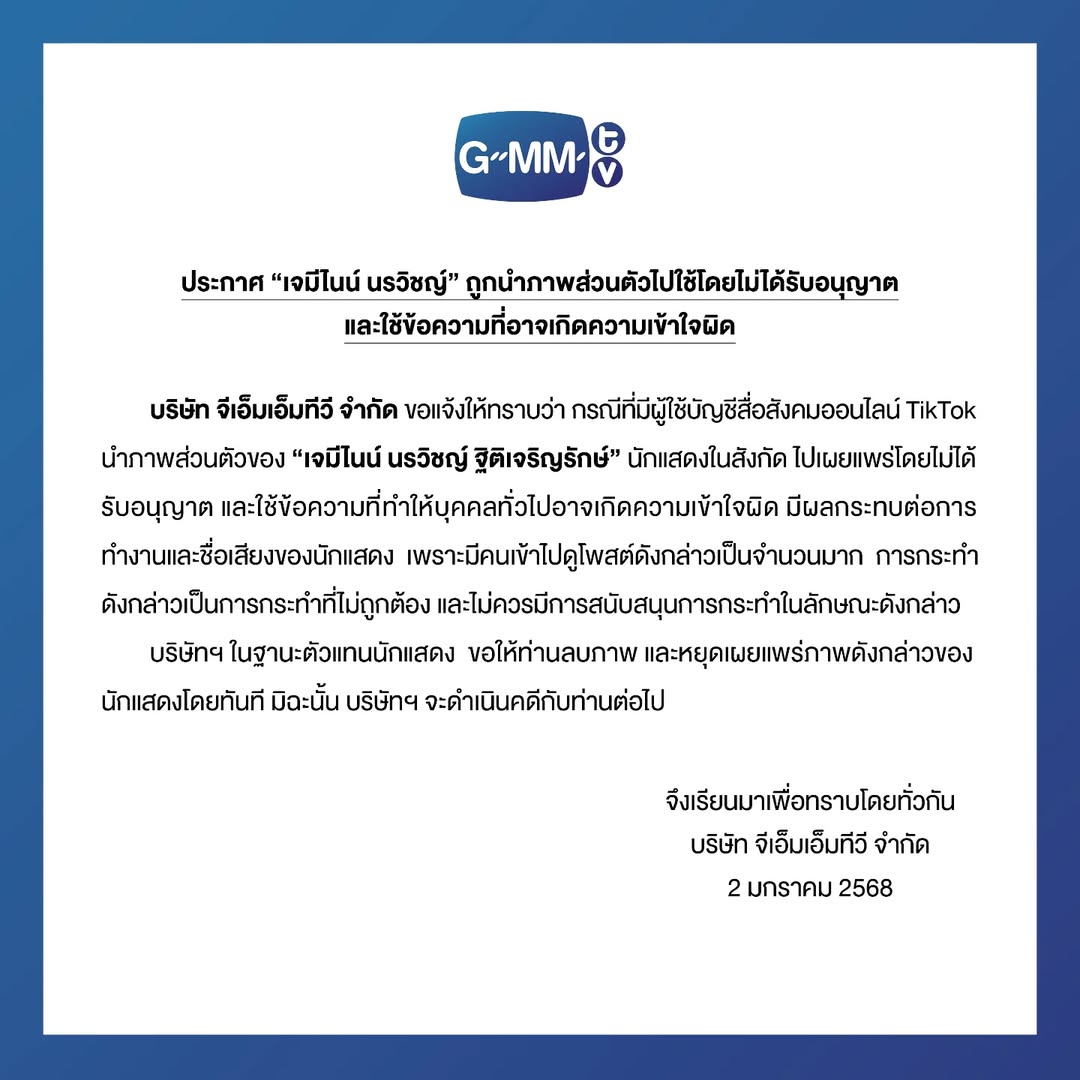 บริษัท จีเอ็มเอ็มทีวี จำกัด ขอแจ้งให้ทราบว่า กรณีที่มีผู้ใช้บัญชีสื่อสังคมออนไลน์ TikTok นำภาพส่วนตัวของ “เจมีไนน์ นรวิชญ์ ฐิติเจริญรักษ์” นักแสดงในสังกัด ไปเผยแพรโดยไม่ได้ รับอนุญาต และใช้ข้อความที่ทำให้บุคคลทั่วไปอาจเกิดความเข้าใจผิด มีผลกระทบต่อการ ทำงานและชื่อเสียงของนักแสดง เพราะมีคนเข้าไปดูโพสต์ดังกล่าวเป็นจำนวนมาก การกระทำดังกล่าวเป็นการกระทำที่ไม่ถูกต้อง และไม่ควรมีการสนับสนุนการกระทำในลักษณะดังกล่าว บริษัทฯ ในฐานะตัวแทนนักแสดง ขอให้ท่านลบภาพ และหยุดเผยแพร่ภาพดังกล่าวของ นักแสดงโดยทันที มีฉะนั้น บริษัทฯ จะดำเนินคดีกับท่านต่อไป จึงเรียนมาเพื่อทราบโดยทั่วกัน บริษัท จีเอ็มเอ็มทีวี จำกัด 2 มกราคม 2568”
