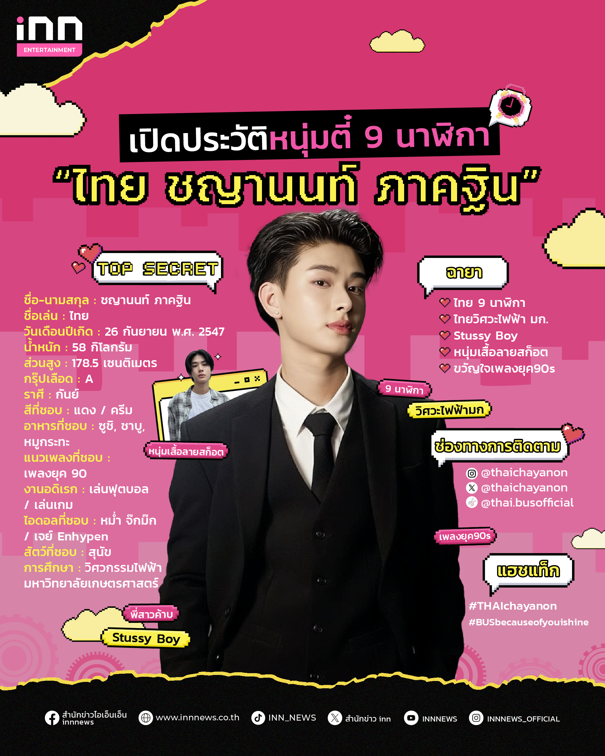 วันนี้ไทยไม่ใช่เด็กหนุ่มที่นั่งร้องเพลงในห้องออดิชั่นแคบๆ อีกต่อไปแล้ว เขากลายเป็น “ไทย ชญานนท์” หรือ “ไทย BUS” ไอดอลหน้าใหม่ที่ทุกคนจับตามอง ไทยส่องแสงเจิดจ้าได้เพราะตัวเขาเองและบีอัสทุกคนที่อยู่เคียงข้าง สำหรับใครที่อยากติดตามผลงานของไทยสามารถตามได้ที่ช่องทางด้านล่างนี้ และครั้งหน้า INN News จะพาไปทำความรู้จักศิลปินคนไหนฝากติดตามด้วยน้าาาา