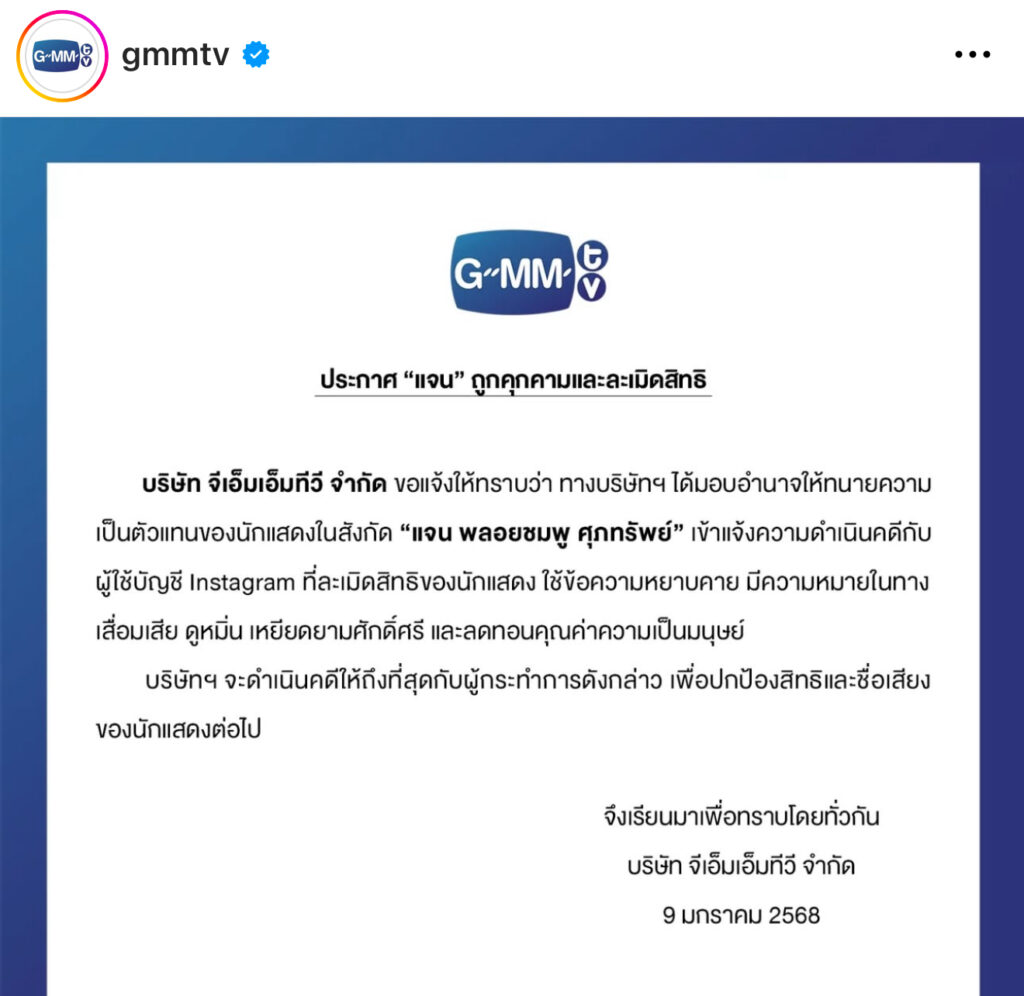 ปิดท้ายกันที่นักแสดงสาว “แจน พลอยชมพู” ที่ส่งทนายเข้าแจ้งความดำเนินคดีกับผู้ใช้บัญชี Instagram ที่ละเมิดสิทธิของนักแสดง ใช้ข้อความหยาบคาย มีความหมายในทางเสื่อมเสีย ดูหมิ่น เหยียดยามศักดิ์ศรี และลดทอนคุณค่าความเป็นมนุษย์ จึงทำให้ทางต้นสังกัดร่อนจดหมาย จะดำเนินคดีให้ถึงที่สุดกับผู้กระทำการดังกล่าว เพื่อปกป้องสิทธิและชื่อเสียงของนักแสดงต่อไป