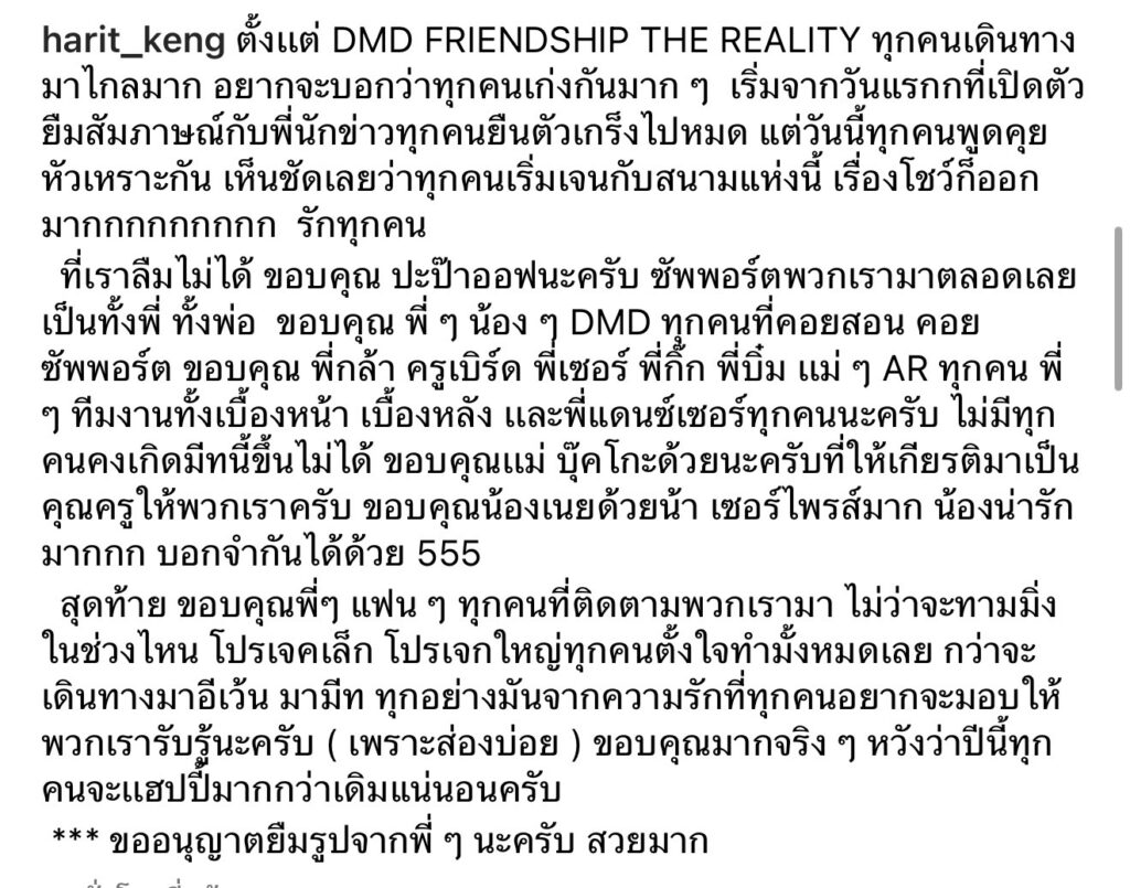 โดยล่าสุดทางด้าน”เก่ง หฤษฎ์“ ได้ออกมาโพสต์ภาพ พร้อมแคปชั่นว่า ”ตั้งแต่ DMD FRIENDSHIP THE REALITY ทุกคนเดินทาง มาไกลมาก อยากจะบอกว่าทุกคนเก่งกันมาก ๆ เริ่มจากวันแรกกที่เปิดตัวยืมสัมภาษณ์กับพี่นักข่าวทุกคนยืนตัวเกร็งไปหมด แต่วันนี้ทุกคนพูดพูดคุยหัวเหราะกัน เห็นชัดเลยว่าทุกคนเริ่มเจนกับสนามแห่งนี้ เรื่องโชว์ก็ออกมากกกกกกกกก รักทุกคนที่เราลืมไม่ได้ ขอบคุณ ปะป๊าออฟนะครับ ซัพพอร์ตพวกเรามาตลอดเลยเป็นทั้งพี่ ทั้งพ่อ ขอบคุณ พี่ ๆ น้อง ๆ DMD ทุกคนที่คอยสอน คอยซัพพอร์ต ชอบคุณ พี่กล้า ครูเบิร์ล พี่เชอร์ ที่กิ๊ก พี่ยิ้ม แม่ ๆ AR ทุกคน พี่ๆ ทีมงานทั้งเบื้องหน้า เบื้องหลัง และพี่แดนซ์เชอร์ทุกคนนะครับ ไม่มีทุกคนคงเกิดมีทนี้ขึ้นไม่ได้ ขอบคุณแม่ บุ๊คโกะด้วยนะครับที่ให้เกียรติมาเป็นคุณครูให้พวกเราครับ ขอบคุณน้องเนยด้วยน้า เซอร์ไพรส์มาก น้องน่ารักมากกก บอกจำกันได้ด้วย 555สุดท้าย ขอบคุณพี่ๆ แฟน ๆ ทุกคนที่ติดตามพวกเรามา ไม่ว่าจะทามมิ่งในช่วงไหน โปรเจคเล็ก โปรเจกใหญ่ทุกคนตั้งใจทำมั้งหมดเลย กว่าจะเดินทางมาอีเว้น มามีท ทุกอย่างมันจากความรักที่ทุกคนอยากจะมอบให้พวกเรารับรู้นะครับ ( เพราะส่องบ่อย ) ขอบคุณมากจริง ๆ หวังว่าปีนี้ทุกคนจะแฮปปี้มากกว่าเดิมแน่นอนครับ