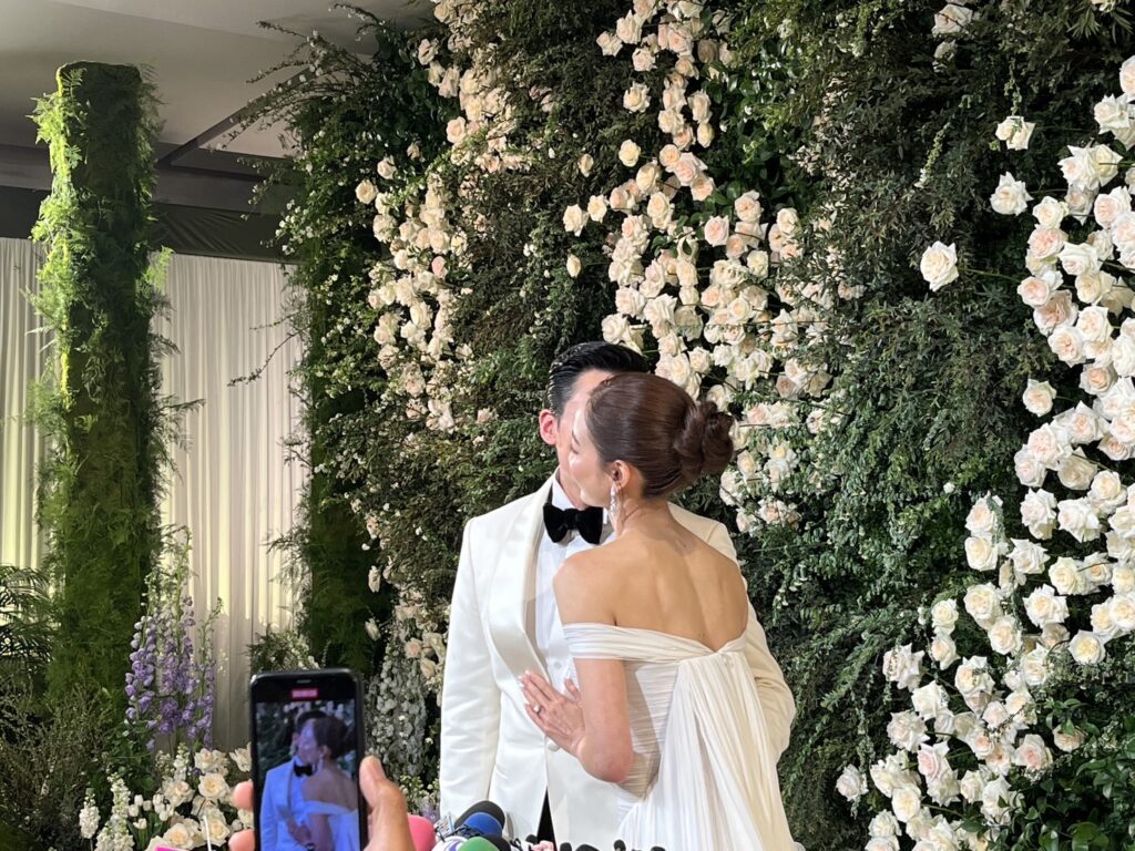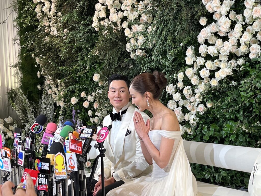 ล่าสุดช่วงบ่ายเจ้าบ่าว เจ้าสาวได้ ควงกันมาในชุดสีขาว เรียบหรู ตั้งโต๊ะแถลงข่าวเปิดใจสื่อมวลชนว่า