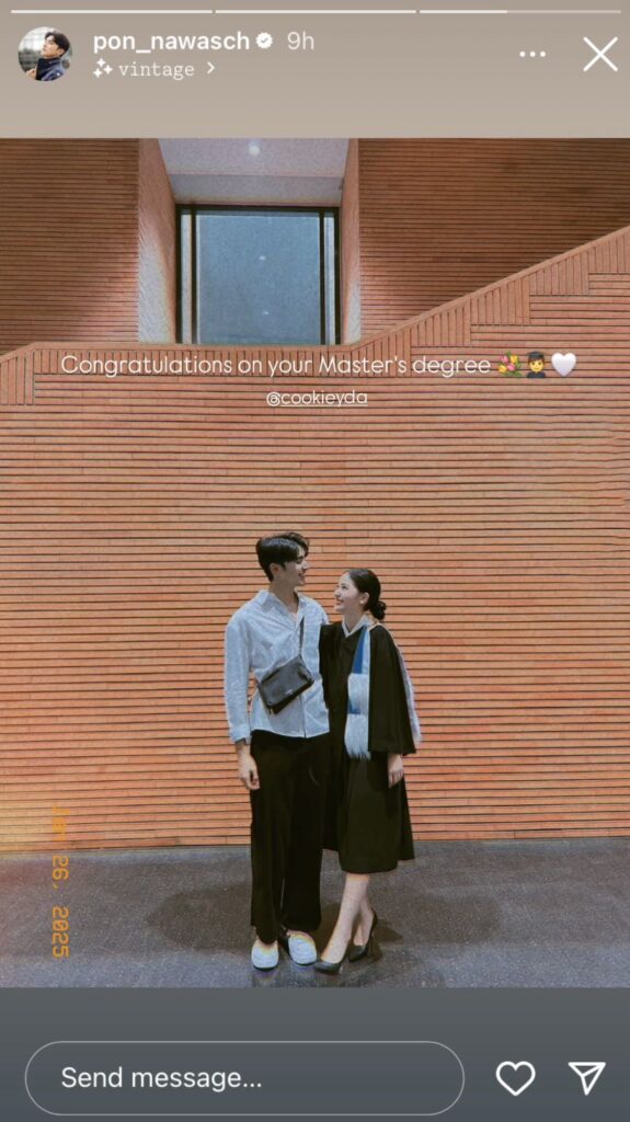 ล่าสุดหนุ่ม “ภณ ณวัสน์” ได้ออกมาโพสต์แสดงความยินดีทางอินสตาแกรมส่วนตัว ถีงหวานใจ “คุกกี้ ญดา” นางเอกสาวจากช่องวัน ที่สำเร็จการศึกษาระดับปริญญาโท สาขาธุรกิจอสังหาริมทรัพย์ คณะพาณิชยศาสตร์และการบัญชี จากมหาวิทยาลัยธรรมศาสตร์ ด้วยการลงภาพคู่ในสตอรี่ไอจี พร้อมข้อความว่า “Congratulations on your Master’s degree” เรียกได้ว่าถ้ามีลิสต์พระเอกคลั่งรักสุดหวานจะต้องมีชื่อ “ภณ ณวัสน์” ด้วยอย่างแน่นอน