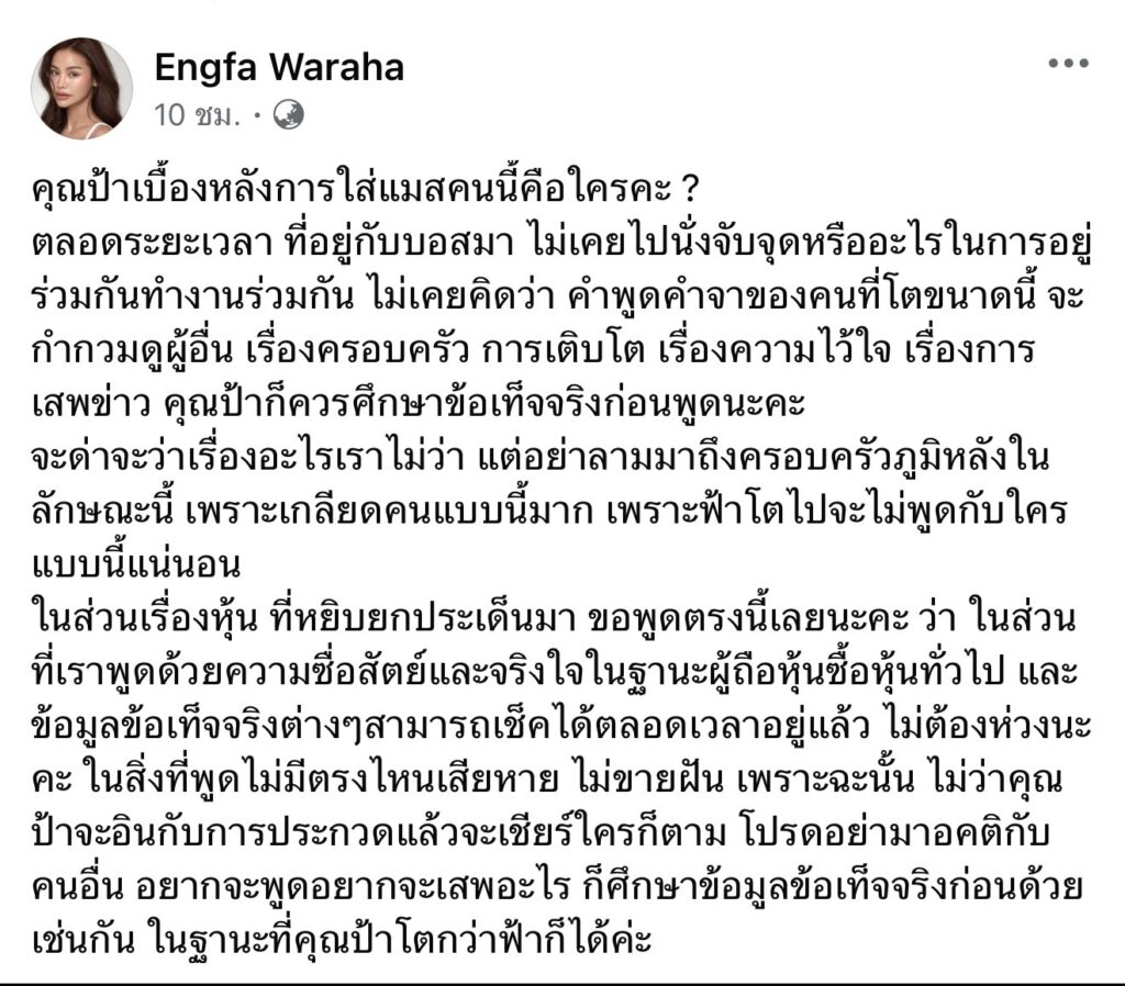 “ในส่วนเรื่องหุ้น ที่หยิบยกประเด็นมา ขอพูดตรงนี้เลยนะคะ ว่า ในส่วนที่เราพูดด้วยความซื่อสัตย์และจริงใจในฐานะผู้ถือหุ้นซื้อหุ้นทั่วไป และข้อมูลข้อเท็จจริงต่างๆสามารถเช็คได้ตลอดเวลาอยู่แล้ว ไม่ต้องห่วงนะคะ ในสิ่งที่พูดไม่มีตรงไหนเสียหาย ไม่ขายฝัน เพราะฉะนั้น ไม่ว่าคุณป้าจะอินกับการประกวดแล้วจะเชียร์ใครก็ตาม โปรดอย่ามาอคติกับคนอื่น อยากจะพูดอยากจะเสพอะไร ก็ศึกษาข้อมูลข้อเท็จจริงก่อนด้วยเช่นกัน ในฐานะที่คุณป้าโตกว่าฟ้าก็ได้ค่ะ”