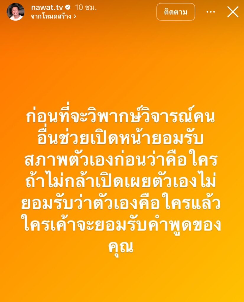 และอีกสตอรี่ว่า ”ก่อนที่จะวิพากษ์วิจารณ์คน อื่นช่วยเปิดหน้ายอมรับสภาพตัวเองก่อนว่าคือใครถ้าไม่กล้าเปิดเผยตัวเองไม่ยอมรับว่าตัวเองคือใครแล้วใครเค้าจะยอมรับคำพูดของคุณ“