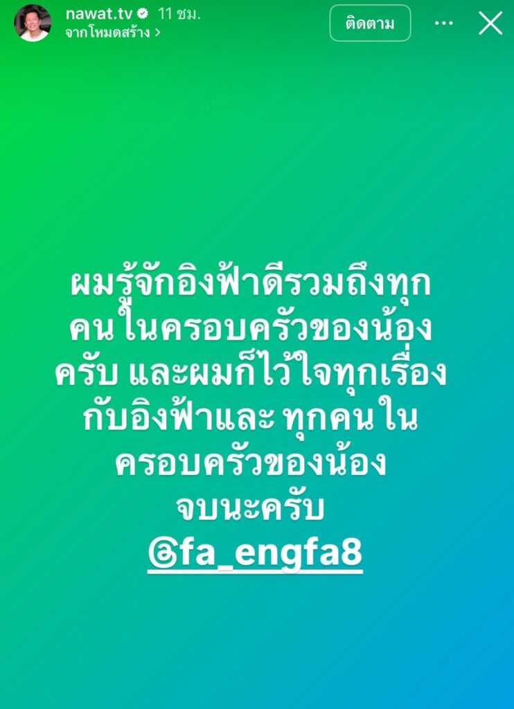 ขณะเดียวกันทางด้าน ”บอสณวัฒน์“ ก็ได้โพสต์ข้อความ ลงในไอจีสตอรี่พร้อมแท็กถึง ”อิงฟ้า“ว่า “ผมรู้จักอิงฟ้าดีรวมถึงทุกคนในครอบครัวของน้องครับ และผมก็ไว้ใจทุกเรื่องกับอิงฟ้าและทุกคนในครอบครัวของน้อง จบนะครับ”