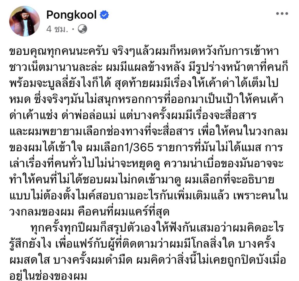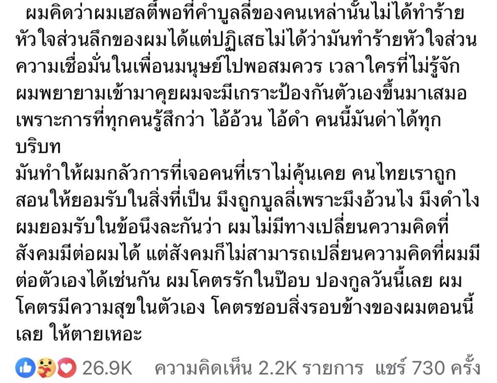 “ขอบคุณทุกคนนะครับ จริงๆแล้วผมก็หมดหวังกับการเข้าหาชาวเน็ตมานานละล่ะ ผมมีแผลข้างหลัง มีรูปร่างหน้าตาที่คนก็พร้อมจะบูลลี่ยังไงก็ได้ สุดท้ายผมมีเรื่องให้เค้าด่าได้เต็มไปหมด ซึ่งจริงๆมันไม่สนุกหรอกการที่ออกมาเป็นเป้าให้คนเค้าด่าเค้าแช่ง ด่าพ่อล่อแม่ แต่บางครั้งผมมีเรื่องจะสื่อสาร