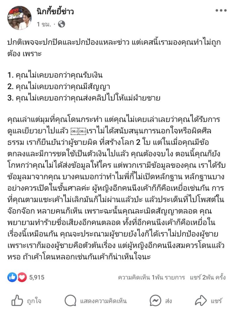 ด้าน “โม” เองออกมาปฏิเสธชัดเจนว่า เธอไม่เคยปล่อยคลิปหรือหลักฐานใด ๆ และไม่มีความคิดที่จะแฉใคร อย่างไรก็ตาม เพจนิกกี้ขยี้ข่าวกลับออกมาชี้แจงว่า ““ปกติเพจจะปกปิดและปกป้องแหละข่าว แต่เคสนี้เรามองคุณทำไม่ถูกต้อง เพราะ 1. คุณไม่เคยบอกว่าคุณรับเงิน 2. คุณไม่เคยบอกว่าคุณมีสัญญา 3. คุณไม่เคยบอกว่าคุณส่งคลิปไปให้แม่ฝ่ายชาย คุณเล่าแต่มุมที่คุณโดนกระทำ แต่คุณไม่เคยเล่าเลยว่าคุณได้รับการดูแลเยียวยาไปแล้ว เราไม่ได้สนับสนุนการนอกใจหรือผิดศีลธรรม เราก็ยืนยันว่าผู้ชายผิด ที่สร้างโลก 2 ใบ แต่ในเมื่อคุณมีข้อตกลงและมีการชดใช้เป็นตัวเงินไปแล้ว คุณต้องจบไง ตอนนี้คุณก็ยังโกหกว่าคุณไม่ได้ส่งข้อมูลให้ใคร แต่พวกเรามีข้อมูลของคุณ เราได้รับข้อมูลมาจากคุณ”