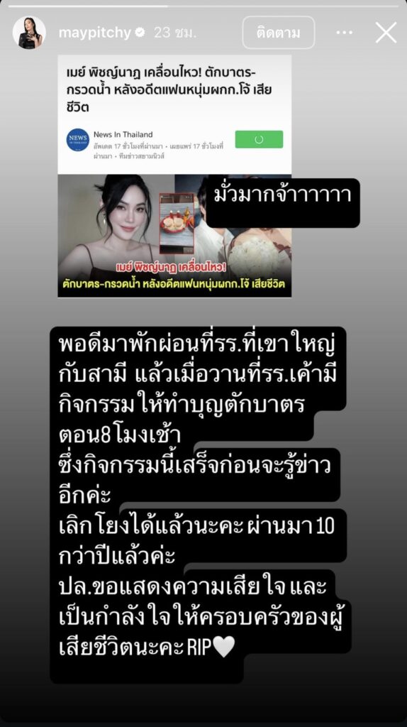 เรียกได้ว่าตกเป็นประเด็นอีกแล้วสำหรับนักแสดงสาวอย่าง “เมย์ พิชญ์นาฏ” ที่หลังจากผู้กำกับชื่อดังอดีตแฟนหนุ่มเสียชีวิตจนตกเป็นข่าวดังที่หลายๆคนให้ความสนใจ ณ ขณะนี้ และทางด้าน”เมย์” ได้โพสต์สตอรี่ทำบุญตักบาตรพอดี ทำให้ชาวเน็ตโยงไปต่างๆนาๆถึงเรื่องการทำบุญกรวดน้ำให้อดีตคนรักผู้ล่วงลับอย่าง “ผู้กำกับโจ้”