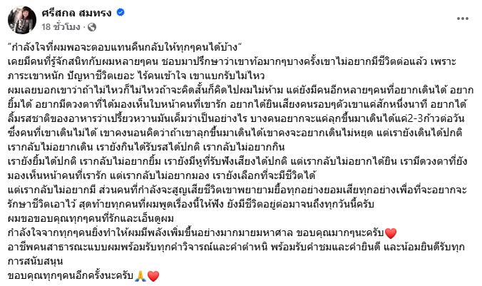 “ส่วนคนที่กำลังจะสูญเสียชีวิตเขาพยายามยื้อทุกอย่างยอมเสียทุกอย่างเพื่อที่จะอยากจะรักษาชีวิตเอาไว้ สุดท้ายทุกคนที่ผมพูดเรื่องนี้ให้ฟัง ยังมีชีวิตอยู่ต่อมาจนถึงทุกวันนี้ครับ ผมขอขอบคุณทุก ๆ คนที่รักและเอ็นดูผม กำลังใจจากทุก ๆ คนยิ่งทำให้ผมมีพลังเพิ่มขึ้นอย่างมากมายมหาศาล ขอบคุณมาก ๆ นะครับ❤️”