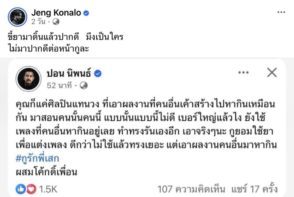 ต่อมา ”ปอน นิพนธ์” เจ้าของเพลง “ไทม์แมชชีน” ได้โพสต์ข้อความทาง Facebook โดยมีข้อความว่า “คุณก็แค่ศิลปินแทนวง ที่เอาผลงานที่คนอื่นเค้าสร้าง ไปหากินเหมือนกัน มาสอนคนนั้นคนนี้ แบบนั้นแบบนี้ไม่ดี เบอร์ใหญ่แล้วไง ยังใช้เพลงคนอื่นหากินอยู่เลย ทำทรงรันเองอีก เอาจริงๆ นะ กูยอมใช้ยาเพื่อแต่งเพลง ดีกว่าไม่ใช้แล้วทรงเยอะ แต่เอาผลงานคนอื่นมาหากิน #กูรักพี่เสก ผสมโค้กดิเพื่อน” ซึ่งเมื่อได้อ่านแล้วก็รู้เลยว่าหมายถึง “เจ๋ง บิ๊กแอส”