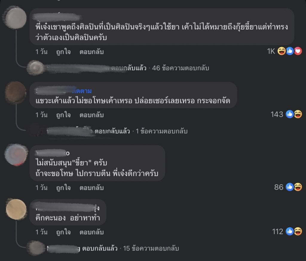 และเหตุผลที่ปิด Facebook เพราะว่ามันมีปัญหาถึงครอบครัว เพื่อนพี่น้องที่อยู่ทำเพลงด้วยกัน และแฟนกำลังท้องอยู่ ไม่อยากให้มันบานปลายไปถึงพวกเขา รู้สึกผิดกับสิ่งที่โพสต์ไป เรื่องการใช้ยาใสการทำเพลง จริงๆ แล้วไม่ได้สนับสนุนเรื่องนี้ ขอโทษทุกคนที่ทำให้เข้าใจผิด และทำให้นักร้องนักดนตรีรู้สึกแย่กับคำพูด ที่ใช้อารมณ์ตัดสินและใช้อารมณ์ในการโพสต์