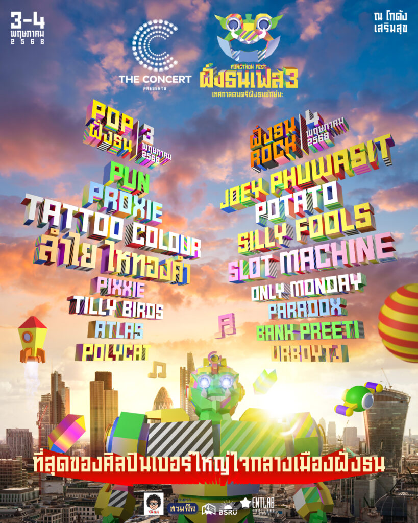 เทศกาลดนตรีที่รอคอยกลับมาแล้ว บอกเลยว่าปีนี้ ฝั่งธนเฟส 3 (เทศกาลดนตรีฝั่งธนยักษ์นะ) มันส์กว่า! ยักษ์กว่า! ยกระดับความสนุกขึ้นไปอีกขั้น จัดเต็ม 2 วัน 2 สไตล์แบบจุใจไปเลย โดดสุดเหวี่ยงไปกับศิลปินเบอร์ใหญ่ใจกลางเมืองฝั่งธน จัดเต็มกับความ POP ในวันเสาร์ที่ 3 พฤษภาคม 2568 พบกับ PUN , PROXIE , PIXXIE, TILLY BIRDS , ลำไย ไหทองคำ , TATTOO COLOUR , ATLAS , POLYCAT สุดมันส์กับความ ROCK ในอาทิตย์ที่ 4 พฤษภาคม 2568 พบกับ โจอี้ ภูวศิษฐ์ , SLOT MACHINE , ONLY MONDAY , POTATO , SILLY FOOLS , PARADOX , แบงค์ ปรีติ , URBOYTJ