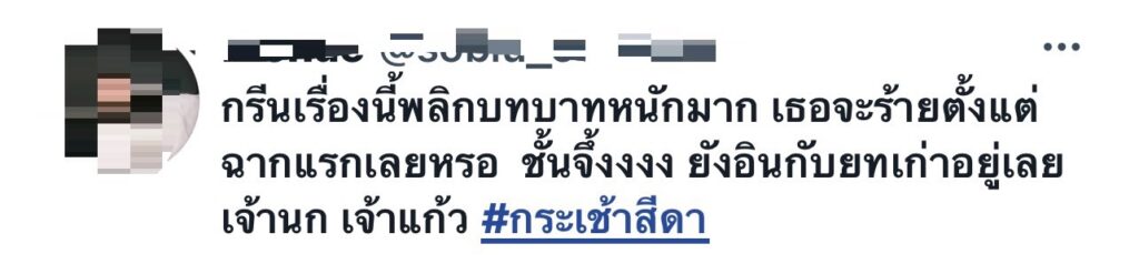 เล่นร้ายได้ถึงอกถึงใจคนจนเข้าไปอยู่ในใจของแฟนละครไปเป็นที่เรียบร้อย สำหรับ กรีน–อัษฎาพร สิริวัฒน์ธนกุล ที่ฟาดฝีมือแสดงแสนยานุภาพทางการแสดงร้ายได้อย่างสุดขั้วกับบทบาทของ รำนำ ใน กระเช้าสีดา ผลิตโดยCHANGE2561 เพียง Ep. แรกแฟนละครต่างก็เข้าคอมเมนต์อย่างร้อนแรงกันฉากต่อฉากอินจัดจนอยากทะลุจอเข้าไปฟ้อนเล็บ สาวกรีน เล่นได้ดีเข้าได้ถึงบทแบบนี้เอาคะแนนเต็มสิบไม่หักไปเลยจ๊ะ