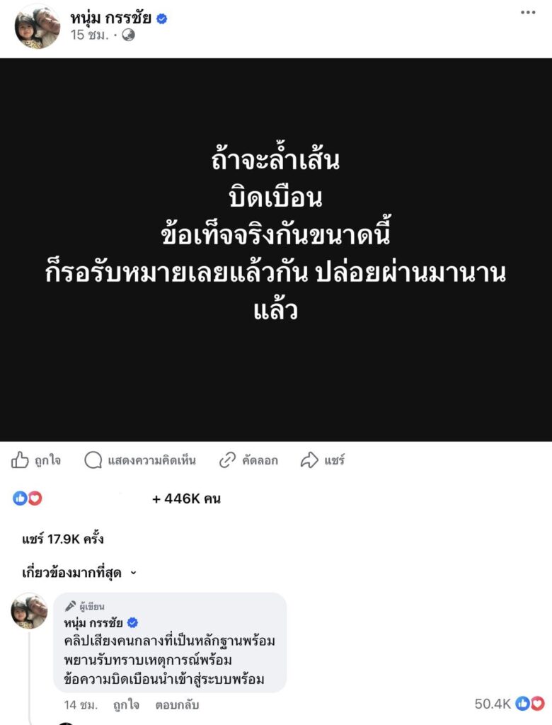 ล่าสุดก็ทำเอาชาวเน็ตลุกฮือฮากันอย่างพร้อมเพรียง เมื่อ “หนุ่ม กรรชัย” ได้อออกมาโพสต์ข้อความผ่านทาง Facebook แบบสุดเดือด เตรียมดำเนินคดีทางกฎหมายกับผู้ล้ำเส้นและบิดเบือนข้อเท็จจริง โดยระบุว่า