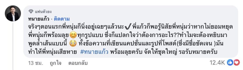 และทางด้าน “ทนายแก้ว มนต์ชัย” ก็ได้เข้ามาแสดงความคิดเห็นใต้โพสต์ว่า “จริงๆตอนแรกพี่หนุ่มก็นิ่งอยู่เฉยๆ แล้วนะ พี่แก้วก็พอรู้นิสัยพี่หนุ่มว่าหากไม่ยอมหยุด พี่หนุ่มก็พร้อมลุยทุกรูปแบบ ซึ่งก็แปลกใจว่าต้องการอะไร?? ทำไมจะต้องหยิบมาพูดล้ำเส้นแบบนี้ ทั้งข้อความที่เขียนแคปชั่นและรูปที่โพสต์(ซึ่งมีชื่อชัดเจน) มันทำให้พี่หนุ่มเสียหาย #ทนายแก้ว พร้อมลุยครับ จัดให้ชุดใหญ่ รอรับหมายครับ”