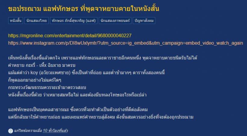 ต่อมามีชาวเน็ตรายหนึ่งได้ออกมาโพสต์เดือดตั้งกระทู้พันทิปดอทคอม ว่า “ขอประณาม แอฟทักษอร ที่พูดจาหยาบคายในหนังสั้น” ซึ่งเขียนระบุว่า “เห็นหนังสั้นเรื่องนี้แล้วตกใจ เพราะ แอฟ ทักษอร และดาราชายอีกคนหนึ่ง พูดจาหยาบคายชนิดรับไม่ได้ คำหยาบ กะxรี่ – เหี้x ฉิบxาย มาครบแม้แต่คำว่า kxy อวัยวะเพศชาย ซึ่งเป็นคำที่ถ่อยและต่ำช้ามาก ๆ ดาราทั้งสองคนนี้ก็พูดออกมาอย่างไม่แคร์ใดๆ กระทรวงวัฒนธรรมควรจะเข้ามาตรวจสอบหนังสั้นเรื่องนี้ด้วย ว่าเหมาะสมหรือไม่ และต้องมีบทลงโทษอะไรหรือเปล่า”