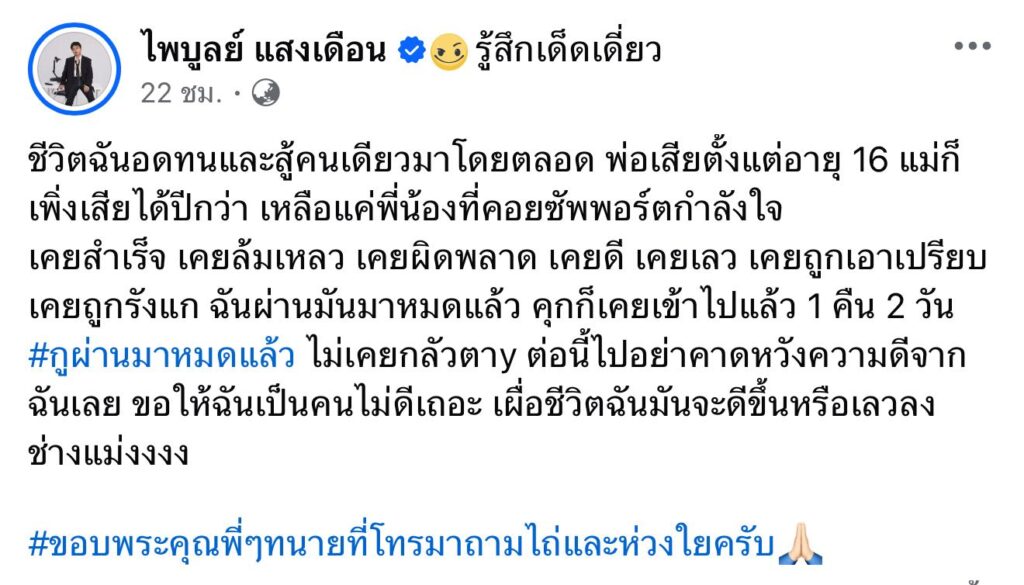 และต่อมา ”ชีวิตฉันอดทนและสู้คนเดียวมาโดยตลอด พ่อเสียตั้งแต่อายุ 16 แม่ก็เพิ่งเสียได้ปีกว่า เหลือแค่พี่น้องที่คอยซัพพอร์ตกำลังใจ เคยสำเร็จ เคยล้มเหลว เคยผิดพลาด เคยดี เคยเลว เคยถูกเอาเปรียบ เคยถูกรังแก ฉันผ่านมันมาหมดแล้ว คุกก็เคยเข้าไปแล้ว 1 คืน 2 วัน #กูผ่านมาหมดแล้ว ไม่เคยกลัวตาy ต่อนี้ไปอย่าคาดหวังความดีจากฉันเลย ขอให้ฉันเป็นคนไม่ดีเถอะ เผื่อชีวิตฉันมันจะดีขึ้นหรือเลวลง ช่างแม่งงงง #ขอบพระคุณพี่ๆทนายที่โทรมาถามไถ่และห่วงใยครับ🙏🏻” ล่าสุด ”ครูไพบูลย์“ ได้ออกมาโพสต์ข้อความว่า ”สรุปไม่ต้องรอฟังไม่ต้องรอเผือก ผมเซาสูนละไม่มีอะไร ผมจะตั้งใจขายของหาเงินใช้หนี้ครับ#ขอบพระคุณทุกความห่วงใย“ ท่ามกลางชาวเน็ตเข้ามาคอมเม้นต์ส่งกำลังใจให้“ครูไพบูลย์” เป็นจำนวนมาก