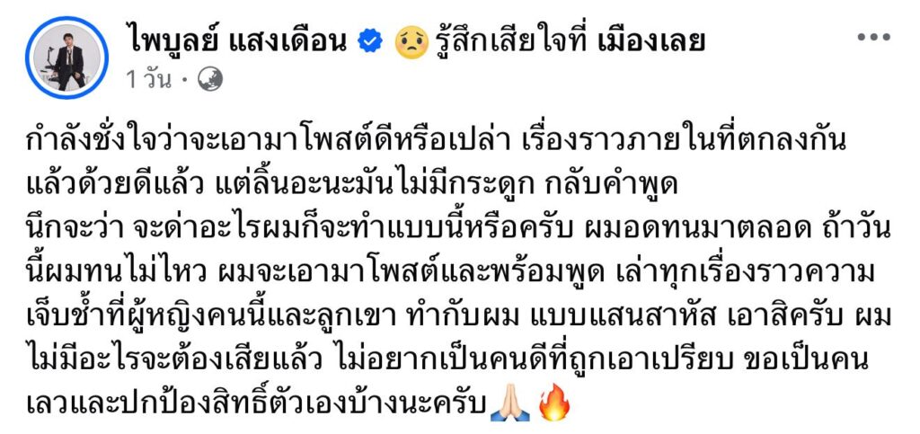 เรียกว่าก่อนหน้านี่ทำเอากระตุกต่อมเผือกไม่ไหว เมื่อทางด้าน “ครูไพบูลย์“ ได้ออกมาฟาดบนเฟซบุ๊คส่อแววทะเลาะกับใครสักคน โดยโพสต์ข้อความว่า ”กำลังชั่งใจว่าจะเอามาโพสต์ดีหรือเปล่า เรื่องราวภายในที่ตกลงกันแล้วด้วยดีแล้ว แต่ลิ้นอะนะมันไม่มีกระดูก กลับคำพูด นึกจะว่า จะด่าอะไรผมก็จะทำแบบนี้หรือครับ ผมอดทนมาตลอด ถ้าวันนี้ผมทนไม่ไหว ผมจะเอามาโพสต์และพร้อมพูด เล่าทุกเรื่องราวความเจ็บช้ำที่ผู้หญิงคนนี้และลูกเขา ทำกับผม แบบแสนสาหัส เอาสิครับ ผมไม่มีอะไรจะต้องเสียแล้ว ไม่อยากเป็นคนดีที่ถูกเอาเปรียบ ขอเป็นคนเลวและปกป้องสิทธิ์ตัวเองบ้างนะครับ🙏🏻🔥“