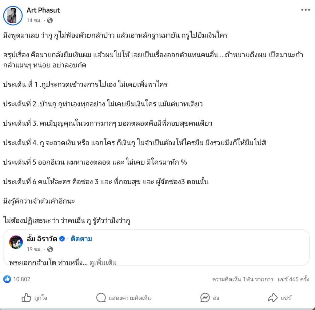 เรียกว่าเป็นประเด็นที่เดือดข้ามคืนสุดๆตอนนี้ สำหรับศึกแป้นพิมพ์กลางโซเชียล ระหว่าง พระเอกหนุ่ม “อาร์ต พศุตม์” กับ อดีตนักร้องค่ายอาร์เอส “อั้ม อิราวัต” ที่ฟาดกันไปมาแบบไม่มีคนยอมใคร โดยจุดเริ่มต้นมาจากที่ “อั้ม” ได้ออกมาโพสต์เหน็บแรง ถึง พระเอกกล้ามโต ท่านหนึ่ง เคยพึ่งพาบุญบารมีผู้ใหญ่ท่านหนึ่ง เข้าวงการ แต่พอผู้ใหญ่ท่านนี้ลำบากกลับไม่ช่วยเหลือ จะบอกแค่ว่า “คนเนรคุณคน ไม่มีวันเจริญ” ท่ามกลางชาวเน็ตต่างคาดเดาไปต่างๆนาๆว่าเป็นใคร จนกระทั้ง หนุ่ม “อาร์ต” ได้ออกมาฟาดกลับโดยการแชร์โพสต์ดังกล่าวและเขียนข้อความไว้ว่า “มึงพูดมาเลย ว่ากู กูไม่ฟ้องด้วยกล้าป่าว แล้วเอาหลักฐานมายัน ทั้งนี้ยังได้ท้าให้ไปออกรายการ “โหนกระแส” ที่พี่ “หนุ่ม กรรชัย” เป็นพิธีกร