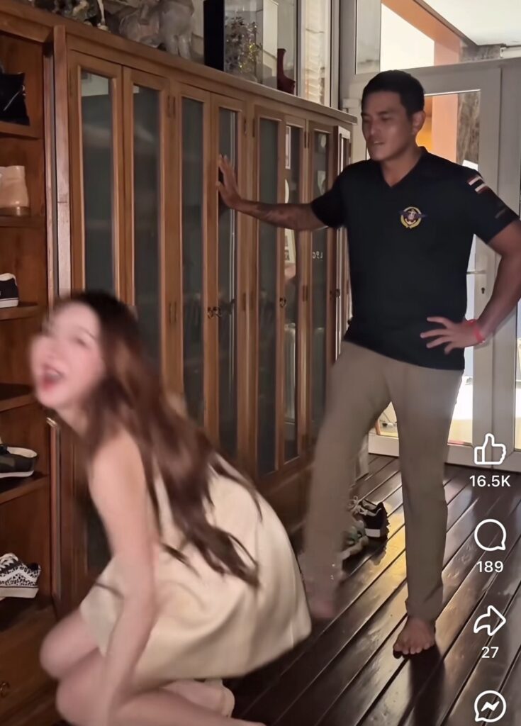 เช่นเดียวกับสาว “มายด์ ณภศศิ“ ที่ไม่พลาดควงแฟนหนุ่ม ”สงกรานต์“ ออกมาทุบสะโพกเก็บของกับเขาบ้าง แต่ที่พีคสุดก็ตอนเก็บของสุดท้ายที่ฝ่ายชาย ใช้เท้าเตะฝ่ายหญิงจนกระเด้น