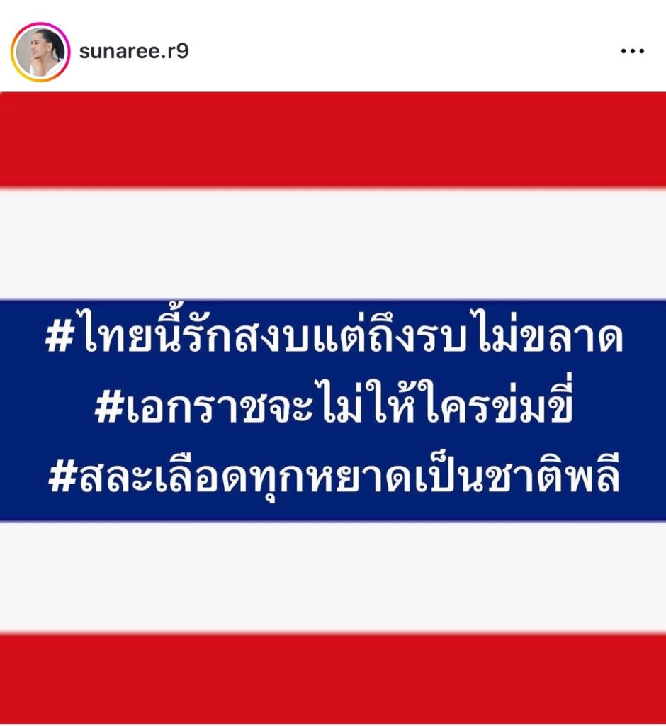 ต่อด้วยนักร้อง “สุนารี ราชสีมา” ก็ออกมาโพสต์ภาพที่เขียนข้อความว่า “#ไทยนี้รักสงบแต่ถึงรบไม่ขลาด #เอกราชจะไม่ให้ใครข่มขี่ #สละเลือดทุกอย่างหยาดเป็นชาติพลี พร้อมเขียนแคปชั่นว่า “ หลานย่าโมขอส่งกำลังใจให้ทหารไทยทุกนาย ได้ปฎิบัติหน้าที่ เพื่อชาติไทยอย่างปลอดภัย