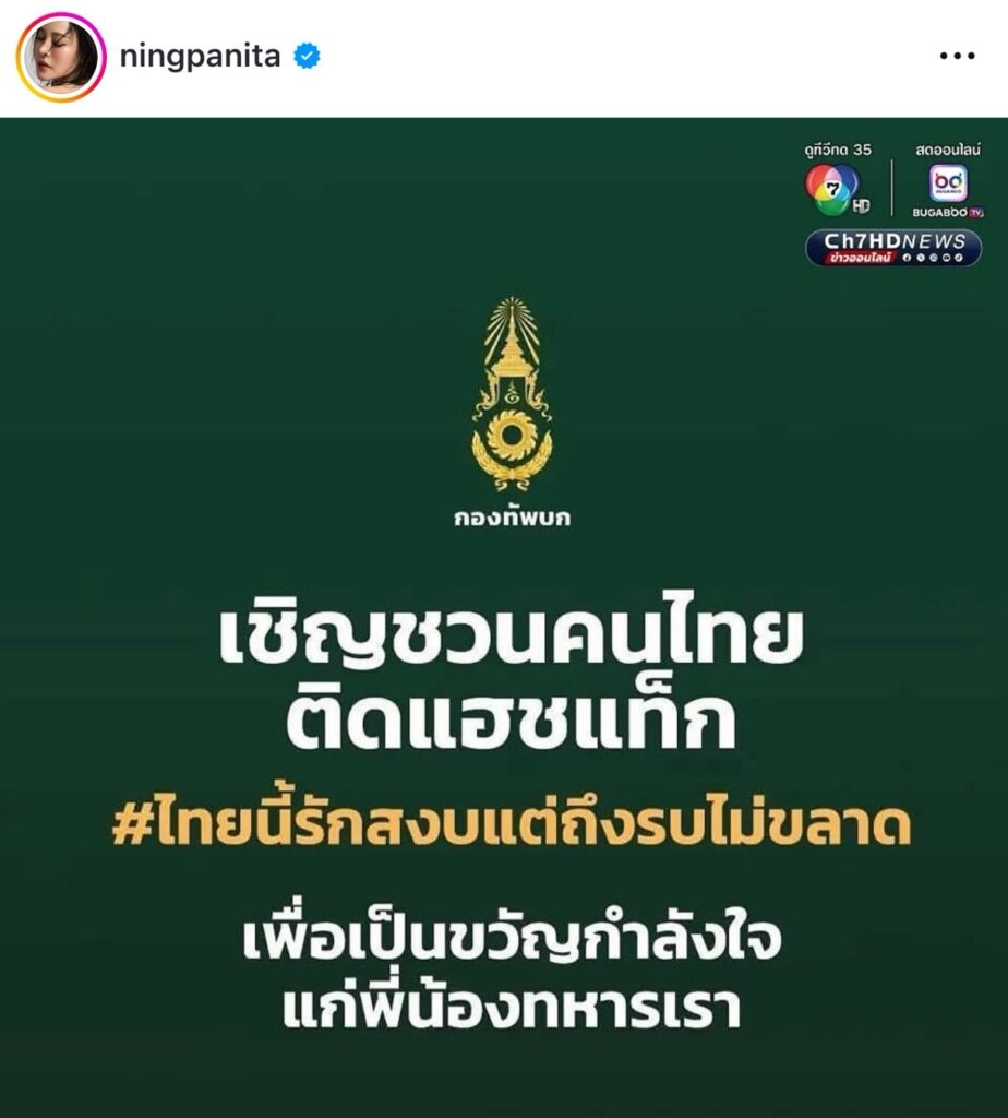 ขณะเดียวกันทาง “หนิง ปณิตา” ก็ออกมาเคลื่อนไหวเช่นกันโดยโพสต์ภาพที่เขียนว่า “เชิญชวนคนไทยติดแฮชแท็ก #ไทยนี้รักสงบแต่ถึงรบไม่ขลาด เพื่อเป็นของขวัญกำลังใจให้แก่พี่น้องทหารเรา