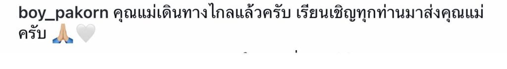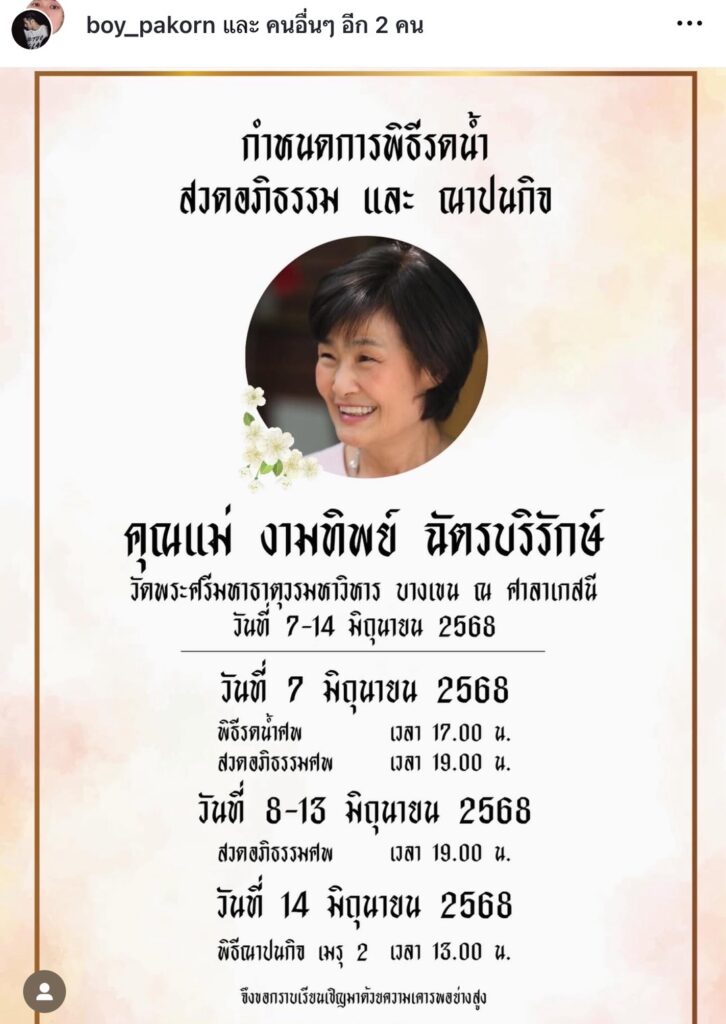นับเป็นข่าวเศร้าครั้งยิ่งใหญ่ให้กับครอบครัวฉัตรบริรักษ์ หลังสูญเสียคุณแม่“งามทิพย์ ฉัตรบริรักษ์” จากไปอย่างสงบ โดยทางด้านนักแสดงหนุ่ม “บอย ปกรณ์” ซึ่งเป็นลูกชายคนโต ได้ออกมาประกาศกำหนดการพิธีรดน้ำ สวดอภิธรรม – ฌาปนกิจ คุณแม่ ที่วัดพระศรีมหาธาตุวรมหาวิหาร บางเขน วันที่7-14 มิถุนายน 2568 พร้อมยังได้เขียนข้อความว่า “คุณแม่เดินทางไกลแล้วครับ เรียนเชิญทุกท่านมาส่งคุณแม่ครับ“