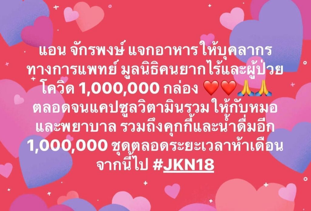 แอน จักรพงษ์ แจกอาหารให้บุคลากรทางการแพทย์ มูลนิธิคนยากไร้ และผู้ป่วยโควิด 1 ล้านกล่อง จาก 5 ภัตตาคารร้านอาหารของ JKN ได้แก่ โอจุ๊บ จีบต้มเปา, จอมพล พริกแกง, เจ๊ณีย์ สายแซ่บ, ข้าวมันไก่ป้าอ้อย และแต้จิ๋ว คิทเช่นตลอดจน แคปซูลวิตามินรวม วีออลิน จำนวน 10,000 ขวดให้กับหมอและพยาบาล รวมถึงคุ๊กกี้และน้ำดื่มอีก 1 ล้านชุดผ่านถุงน้ำใจ แอน จักรพงษ์ ตลอดระยะเวลา 5 เดือนจากนี้ไป รวมมากกว่า 3.2 ล้านชุด