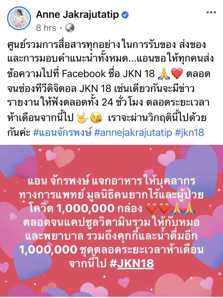 ยังเพิ่มเติมด้วยว่า ขอเป็นศูนย์รวมการสื่อสารทุกอย่างในการรับของ ส่งของและการมอบคำแนะนำทั้งหมด แอนขอให้ทุกคนส่งข้อความไปที่ Facebook ชื่อ JKN 18 🙏❤️ ตลอดจนช่องทีวีดิจิตอล JKN 18 เช่นเดียวกันจะมีข่าวรายงานให้ฟังตลอดทั้ง 24 ชั่วโมง ตลอดระยะเวลา 5 เดือนจากนี้ไป 😘 เราจะผ่านวิกฤตินี้ไปด้วยกันค่ะ