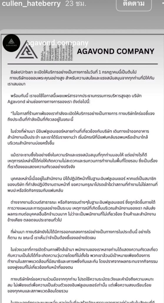 “BakeUrban จะเปิดให้บริการอย่างเป็นทางการในวันที่ 1 กรกฎาคมนี้เป็นต้นไปทางบริษัทขอขอบพระคุณอย่างสูง สำหรับความสนใจและแรงสนับสนุนจากทุกท่านที่มีให้กับเราเสมอมา พร้อมกันนี้ เราขอใช้โอกาสนี้เผยแพร่สารจากประธานกรรมการบริหารสูงสุด บริษัท Agavond ผ่านช่องทางทางการของเรา ดังต่อไปนี้ “ในโอกาสที่ร้านคาเฟ่ของเรากำลังจะเปิดให้บริการอย่างเป็นทางการ ทางบริษัทใคร่ขอชี้แจง ถึงประเด็นที่กำลังเป็นที่กังวลอยู่ในขณะนี้ในช่วงที่ผ่านมา มีอินฟลูเอนเซอร์หลายท่านที่เกี่ยวข้องกับบริษัทเดินทางเข้าออกอาคารสำนักงานเป็นประจำ และเราได้รับรายงานว่าเริ่มมีกรณีที่มีแฟนคลับรอพบหรือเข้ามาใกล้บริเวณสำนักงานบ่อยครั้งขึ้น แม้เราจะซาบซึ้งใจอย่างยิ่งในความรักและแรงสนับสนุนที่ทุกท่านมอบให้ แต่อย่างไรก็ดีเหตุการณ์เหล่านี้ได้ก่อให้เกิดความไม่สะดวกและรบกวนการทำงานในพื้นที่โดยรอบ ซึ่งเป็นเรื่องที่เราต้องขอแสดงความกังวลอย่างจริงจัง บุคคลเหล่านี้เมื่ออยู่ในสำนักงาน มิได้ปฏิบัติหน้าที่ในฐานะอินฟลูเอนเซอร์ หากแต่เป็นสมาชิกของบริษัท ที่กำลังปฏิบัติงานตามหน้าที่ ขอความกรุณาโปรดเข้าใจว่าสถานที่ทำงานไม่ใช่สถานที่พบปะหรือจัดกิจกรรมกับแฟนคลับ ต่างจากงานอีเวนต์สาธารณะ หรือกิจกรรมต่างๆในฐานะอินฟลูเอนเซอร์ ซึ่งถูกจัดขึ้นภายใต้การวางแผนและการดูแลอย่างเป็นระบบ เหตุการณ์ที่เกิดขึ้นบริเวณสำนักงานของเรา กลับส่งผลกระทบต่อบุคคลอื่นอีกจำนวนมาก ไม่ว่าจะเป็นพนักงานที่ไม่เกี่ยวข้อง ร้านค้าและสำนักงาน ข้างเคียง ตลอดจนประชาชนทั่วไป ที่ผ่านมาทางบริษัทยังไม่ได้มีการออกแถลงการณ์อย่างเป็นทางการในประเด็นนี้ อย่างไรก็ตาม ณ ขณะนี้ เราเห็นว่าจำเป็นต้องชี้แจงอย่างชัดเจน ในช่วงเวลาที่การเปิดร้านคาเฟ่ใกล้เข้ามา พนักงานของเราหลายท่านได้แสดงความกังวลเกี่ยว กับความเป็นไปได้ที่จะเกิดความวุ่นวายโดยที่ไม่ตั้งใจ พวกเขาล้วนมีเป้าหมายเพียงต้องการทำงานในสภาพแวดล้อมที่มีสมาธิและเคารพซึ่งกันและกัน โดยปราศจากผลกระทบจากกิจกรรมของฝูงชนที่ไม่เกี่ยวข้องกับหน้าที่ของตน ทางบริษัทใคร่ขอความร่วมมือจากทุกท่าน โปรดใช้ความระมัดระวังและคำนึงถึงความเหมาะสม ไม่เพียงแต่เพื่อความเป็นส่วนตัวของอินฟลูเอนเซอร์เท่านั้น แต่เพื่อความสงบเรียบร้อยของทุกคนและสภาพแวดล้อมโดยรวม ในฐานะองค์กรและชุมชนหนึ่ง เรามุ่งมั่นที่จะสร้างวัฒนธรรมของการอยู่ร่วมกันในสังคมที่ดีงามและน่าเคารพ และเราหวังเป็นอย่างยิ่งว่าจะได้รับความร่วมมือจากทุกท่า