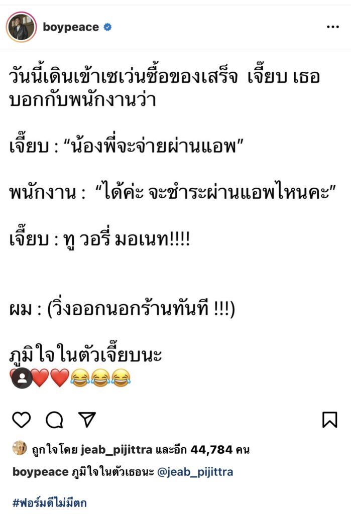 แรงแบบไม่มีแผ่ว !!! พร้อมแกงแบบไม่กลัวภรรยา เจี๊ยบ พิจิตตรา โกรธ หรือ เขิล กันเลยทีเดียว สำหรับสามีที่แสนดี บอย พีซเมคเกอร์ ที่ช่างหยอกช่างเยาภรรยาออกโซเชียลแบบระยะเผาขนทุกช่วงเวลา ในความโก๊ะๆปนความน่ารักของสาวเจี๊ยบ ที่ หนุ่มบอย ก็ทำหน้าที่สามีที่ดีจดจำลงเรื่องราวหลุดๆมาเขียนบอกเล่าให้แฟนๆได้เห็น อย่างล่าสุด ที่เจ้าตัว และ ศรีภรรยา ได้เข้าไปซื้อของในร้านสะดวกซื้อ งานนี้ สาวเจี๊ยบ ก็แอบปล่อยไก่ตัวใหญ่จน หนุ่มบอย ถึงต้องเขียนลงบันทึกสิ่งเล็กๆที่เรียกว่ารอยยิ้มลงไว้ในอินสตราแกรมส่วนตัวทีเดียว ว่าภูมิใจในตัวเธอนะ พร้อมใส่แฮชแท็ก#ฟอร์มดีไม่มีตก