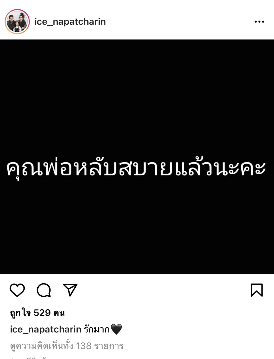 ท่ามกลางกำลังใจจากคนบันเทิง และแฟนคลับ ที่ส่งถึงน้าค่อมและครอบครัวทันทีที่ทราบข่าว แต่แล้วก็สุดยื้อ เมื่อไอซ์ ณพัชรินทร์ ออกมาแจ้งข่าวเศร้าในช่วงเช้านี้ว่า “คุณพ่อหลับสบายแล้วนะคะ”