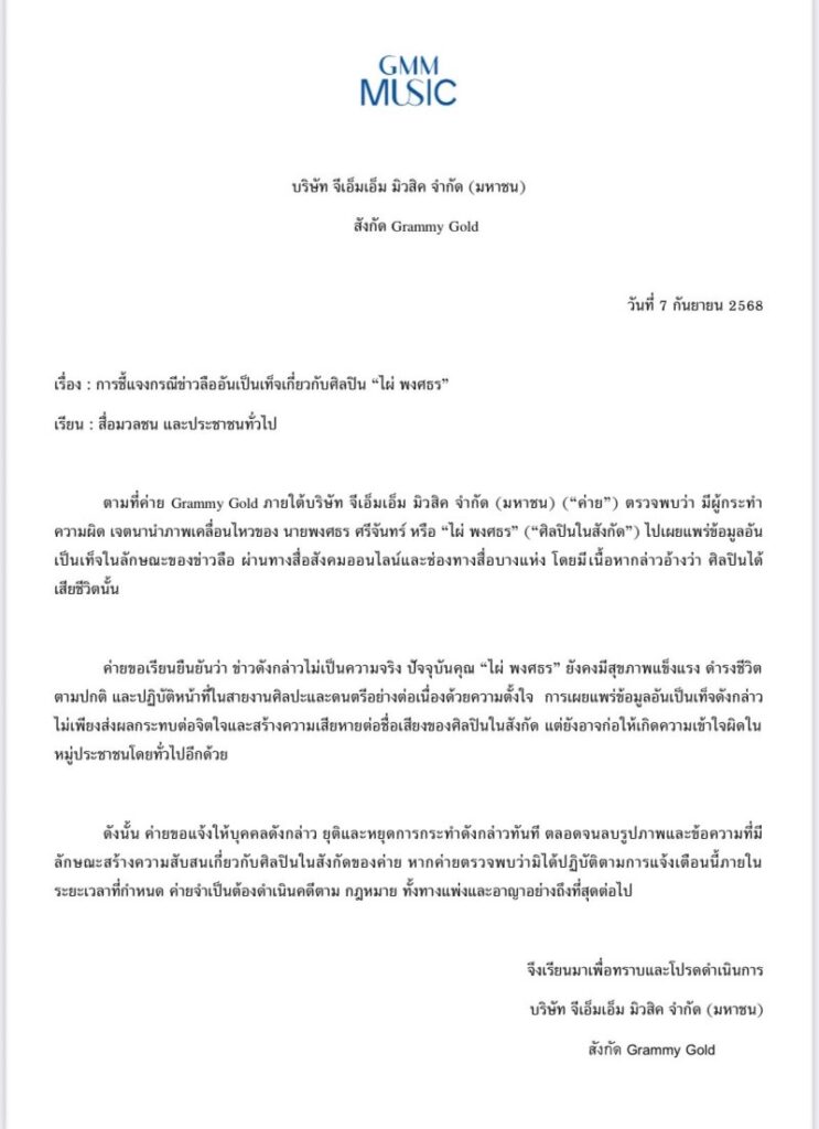 จนล่าสุดทางด้านค่าย ”Grammy Gold“ ต้นสังกัดของ หนุ่ม “ไผ่ พงศธร” ได้ออกมาชี้แจงว่าข่าวการเสียชีวิตของนักร้องหนุ่มไม่เป็นความจริง โดยร่อนจดหมายที่เขียนว่า ”ตามที่ค่าย Grammy Gold ภายใต้บริษัท จีเอ็มเอ็ม มิวสิค จำกัด (มหาชน) (ค่าย) ตรวจพบว่า มีผู้กระทำความผิด เจตนานำภาพเคลื่อนไหวของ
