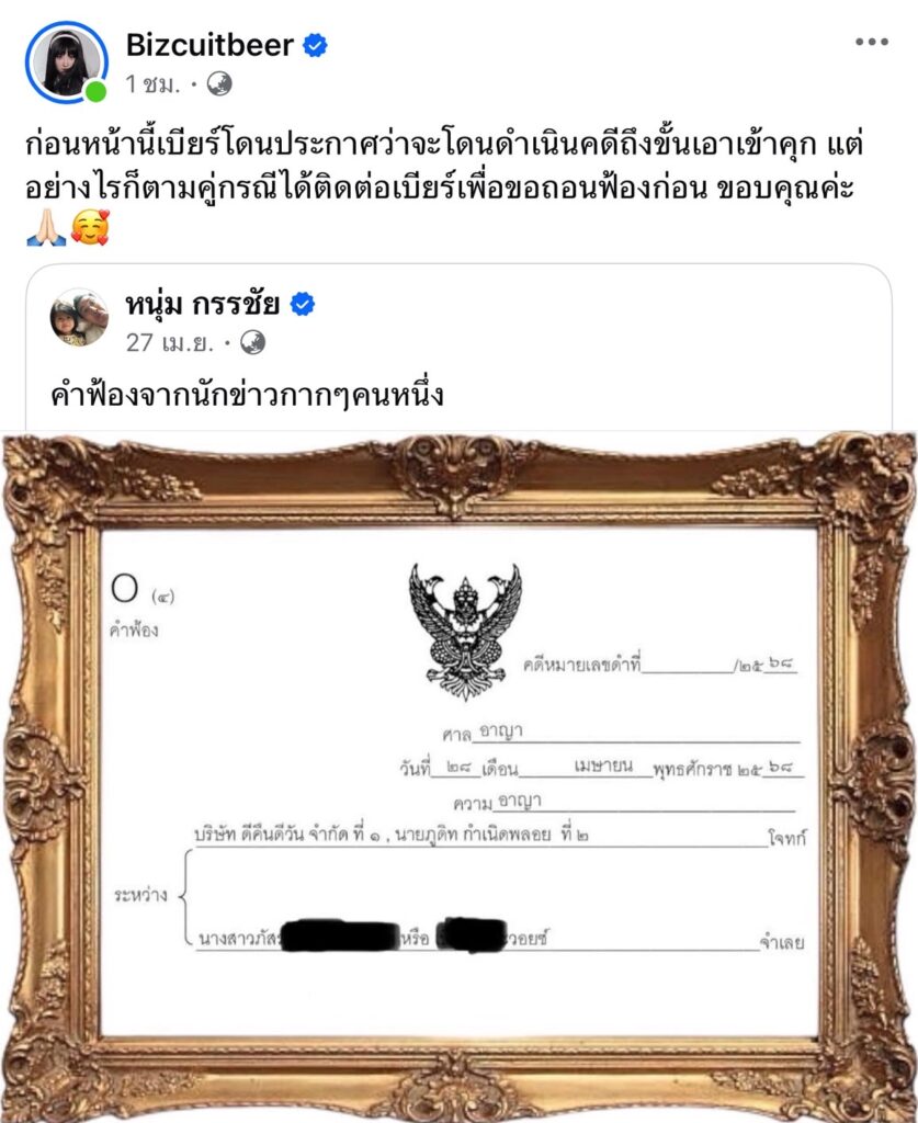 ขณะเดียวกัน ทางด้าน “เบียร์” ก็ได้ออกมาแชร์โพสต์ที่ “หนุ่ม กรรชัย” โพสต์ภาพใบฟ้อง พร้อมแคปชั่นว่า”ก่อนหน้านี้เบียร์โดนประกาศว่าจะโดนดำเนินคดีถึงขั้นเอาเข้าคุก แต่อย่างไรก็ตามคู่กรณีได้ติดต่อเบียร์เพื่อขอถอนฟ้องก่อน ขอบคุณค่ะ 🙏🏻🥰“