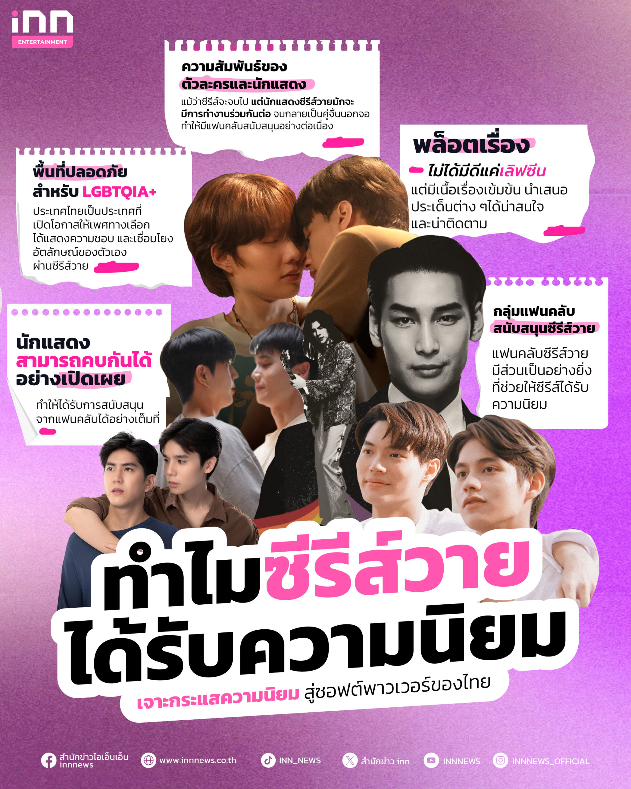ปฏิเสธไม่ได้ว่าถ้าย้อนกลับไปเมื่อ 10 ปีก่อน ซีรีส์วายถือเป็นสิ่งที่แปลกใหม่ในสังคมไทย และไม่ได้รับการยอมรับเท่าที่ควร แต่ในปัจจุบัน ซีรีส์วายกลับกลายมาเป็นซีรีส์ที่ผู้คนให้ความสนใจอย่างล้นหลาม จนแทบจะแซงหน้าละครชายหญิงไปแล้ว