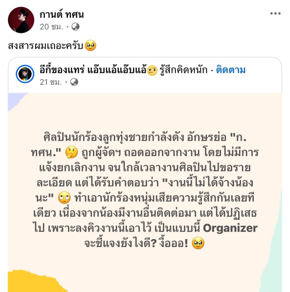 ต่อมาได้ออกมาแชร์โพสต์ที่เพจดังเขียนว่า “ศิลปินนักร้องลูกทุ่งชายกำลังดัง อักษรย่อ “ก. ทศน.” 🤔 ถูกผู้จัดฯ ถอดออกจากงาน โดยไม่มีการแจ้งยกเลิกงาน จนใกล้เวลางานศิลปินไปขอรายละเอียด แต่ได้รับคำตอบว่า “งานนี้ไม่ได้จ้างน้องนะ” 🙄 ทำเอานักร้องหนุ่มเสียความรู้สึกกันเลยทีเดียว เนื่องจากน้องมีงานอื่นติดต่อมา แต่ได้ปฏิเสธไป เพราะลงคิวงานนี้เอาไว้ เป็นแบบนี้ Organizer จะชี้แจงยังไงดี? งื้อออ! 🥹” พร้อมแคปช้่นว่า “สงสารผมเถอะครับ“