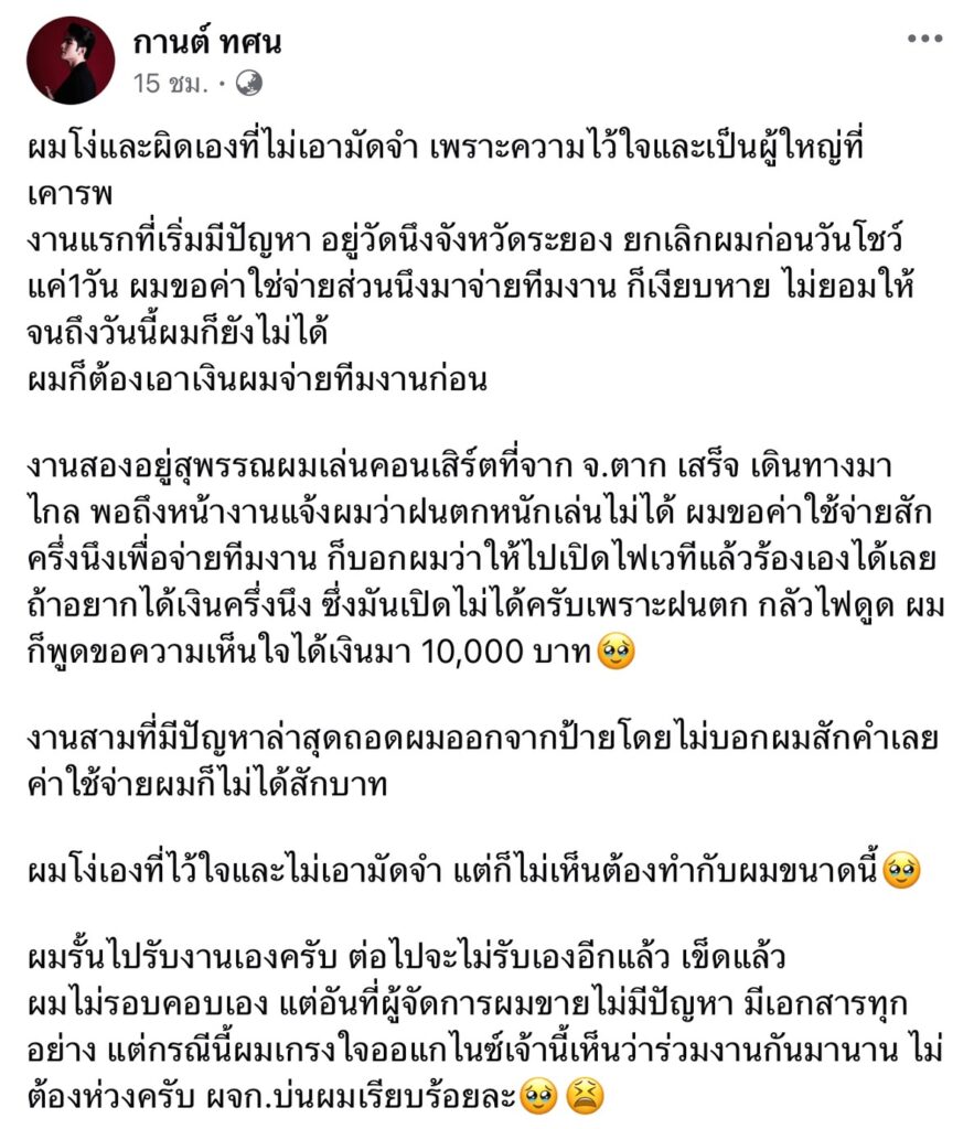 เดือดระอุ! นักร้องหนุ่ม “กานต์ ทศน” โพสต์ระบาย ”ผมโง่เองที่ไว้ใจ“ ดราม่าถูกยกเลิกงาน ยันไม่รอบคอบเอง