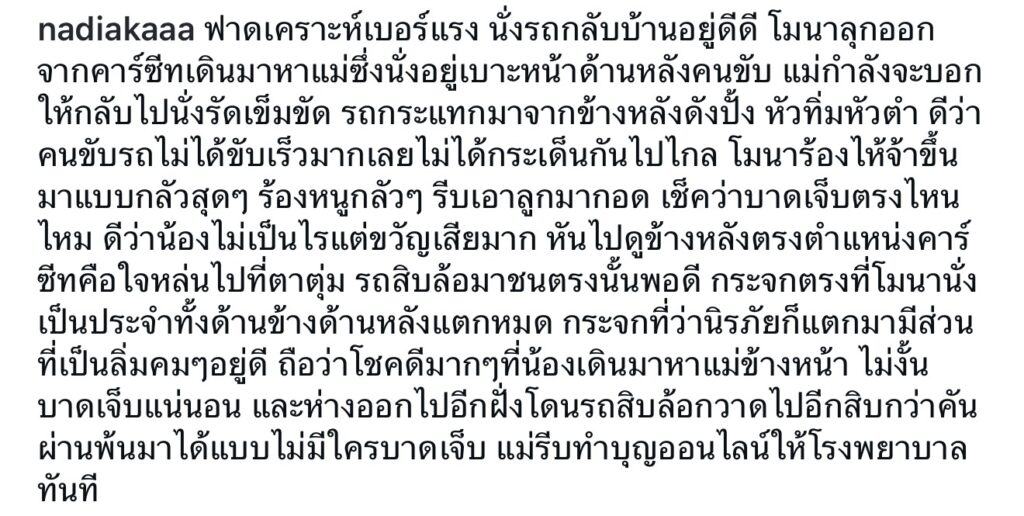ปิดท้ายกันที่ อดีตนักแสดงสาว “นาเดีย โสณกุล” ที่ ทำเอาแฟนคลับแห่เป็นห่วง หลังเจ้าตัว ประสบอุบัติเหตุ ถูกรถสิบล้อพุ่งเข้าชนรถด้านหลัง โดยทางด้าน “นาเดีย” ได้ออกมาโพสต์ภาพพร้อมแคปชั่นว่า “ฟาดเคราะห์เบอร์แรง นั่งรถกลับบ้านอยู่ดีดี โมนาลุกออกจากคาร์ซีทเดินมาหาแม่ซึ่งนั่งอยู่เบาะหน้าด้านหลังคนขับ แม่กำลังจะบอกให้กลับไปนั่งรัดเข็มขัด รถกระแทกมาจากข้างหลังดังปั้ง หัวทิ่มหัวตำ ดีว่าคนขับรถไม่ได้ขับเร็วมากเลยไม่ได้กระเด็นกันไปไกล โมนาร้องไห้จ้าขึ้นมาแบบกลัวสุด ๆ ร้องหนูกลัว ๆ รีบเอาลูกมากอด เช็คว่าบาดเจ็บตรงไหนไหม ดีว่าน้องไม่เป็นไรแต่ขวัญเสียมาก หันไปดูข้างหลังตรงตำแหน่งคาร์ซีทคือใจหล่นไปที่ตาตุ่ม รถสิบล้อมาชนตรงนั้นพอดี กระจกตรงที่โมนานั่งเป็นประจำทั้งด้านข้างด้านหลังแตกหมด กระจกที่ว่านิรภัยก็แตกมามีส่วนที่เป็นลิ่มคม ๆ อยู่ดี ถือว่าโชคดีมาก ๆ ที่น้องเดินมาหาแม่ข้างหน้า ไม่งั้นบาดเจ็บแน่นอน และห่างออกไปอีกฝั่งโดนรถสิบล้อกวาดไปอีกสิบกว่าคัน ผ่านพ้นมาได้แบบไม่มีใครบาดเจ็บ แม่รีบทำบุญออนไลน์ให้โรงพยาบาลทันที”