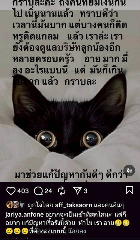 ขยับมาที่นักแสดงรุ่นใหญ่ “นก จริยา“ ที่ทำชาวเน็ตฮือฮาไม่น้อย เมื่อทางด้าน “นก จริยา“ ได้ออกมาโพสต์ข้อความถึงคนที่ยืมเงินไปแล้วไม่คืน โดยเขียนข้อความว่า “กราบล่ะค่ะ ถึงคนที่ยืมเงินกันไปเนิ่นนานแล้ว ทราบดีว่าเวลานี้มันลำบาก แต่บางคนก็ติดหรูติดแกรม แล้วเราล่ะ เรายังต้องดูแลบริษัทลูกน้องอีกหลายครอบครัว อายมากที่ลงอะไรแบบนี้ แต่มันก็เกินไปมากแล้ว กราบล่ะ มาช่วยกันแก้ปัญหาดีกว่า” พร้อมแคปชั่นว่า “อยากเป็นเช้าที่สดใส แต่ก็ยาก แก้ปัญหาเรื้อรังนี้ด้วย ทำไมเราอาย ที่ต้องลงแบบนี้”