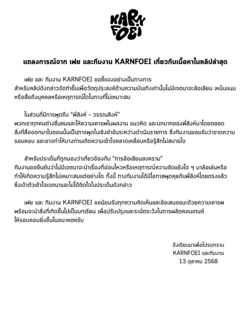 “เฟย และ ทีมงาน KARNFOEI ขอน้อมรับทุกความคิดเห็นและข้อเสนอแนะด้วยความเคารพ พร้อมจะนำสิ่งที่เกิดขึ้นไปเป็นบทเรียน เพื่อปรับปรุงและระมัดระวังในการผลิตคอนเทนต์ให้รอบคอบยิ่งขึ้นในอนาคตครับ จึงเรียนมาเพื่อโปรดทราบ KARNFOEI และทีมงาน 13 ตุลาคม 2568”