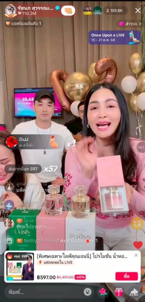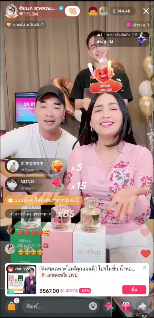 กระแสแรงเกินต้าน! สำหรับ “เทศกาลเจนนี่” ไลฟ์สดขายของแห่งปีของ “เจนนี่ ได้หมดถ้าสดชื่น” ที่มีทัพดารามาร่วมไลฟ์สดอย่างต่อเนื่อง ล่าสุด คู่รักคนดัง “เจมส์ เรืองศักดิ์ และภรรยา ครูก้อย นัชชา ลอยชูศักดิ์” ก็เข้าร่วมเทศกาลไลฟ์สดครั้งนี้ด้วย โดยนำ “น้ำหอมฟอร์เอฟเวอร์ (Forever)” ที่จำหน่ายใน TikTok ช่องคู่กัน มาจัดโปรโมชั่นพิเศษแบบที่ไม่เคยมีมาก่อน ให้แฟนๆ ได้กดตะกร้ากันรัวๆ ดันยอดขายพุ่งทะลุ 2.8 ล้านบาทในเวลาเพียง 5 นาที
