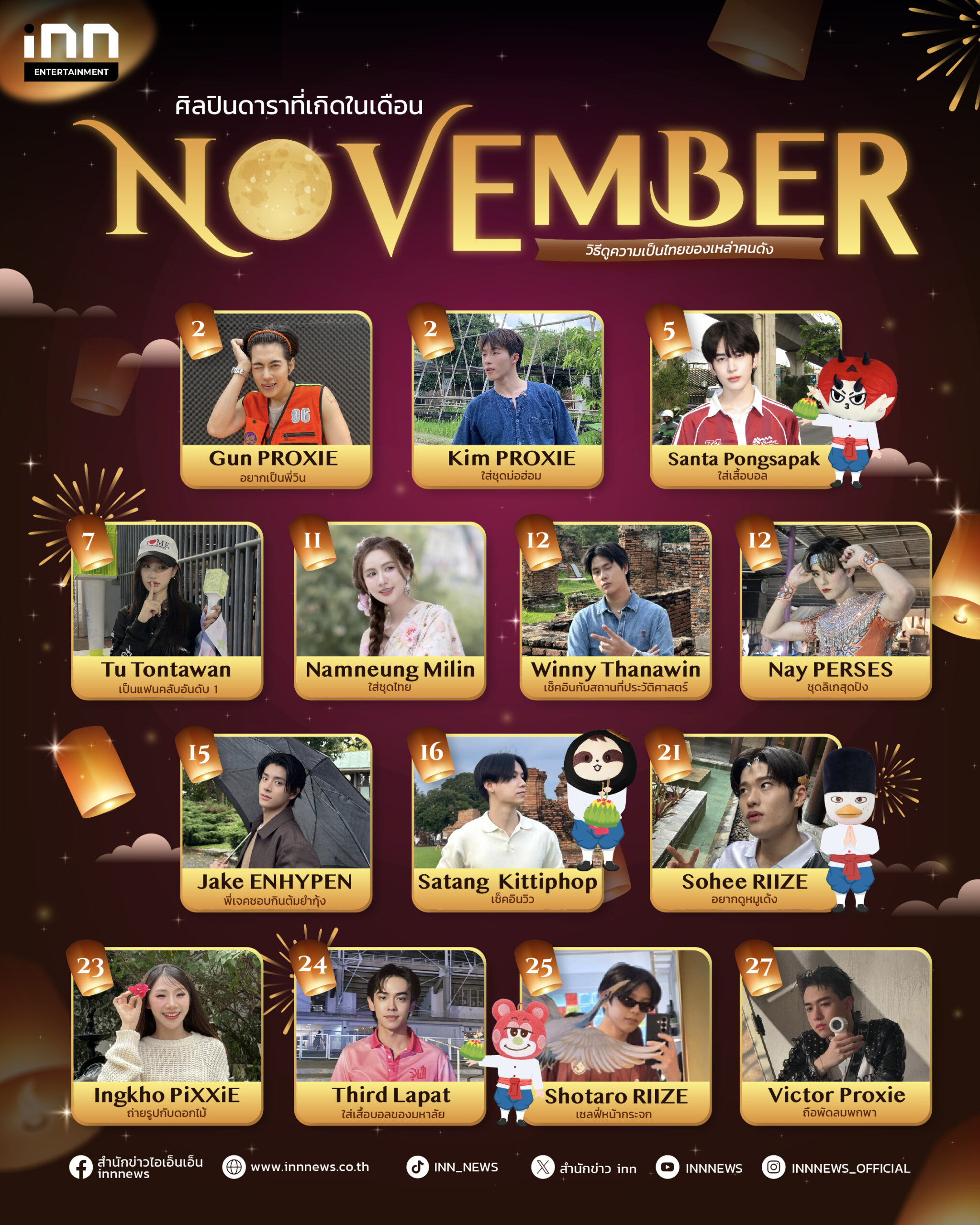 เพื่อตอบแทนความรักที่แสนยิ่งใหญ่จากแฟนคลับ ถึง ศิลปินคนโปรด วันสำคัญทั้งที เราขอเป็นส่วนหนึ่งที่จะช่วยส่งต่อความรัก ขอร่วมอวยพรวันเกิดของศิลปิน-นักแสดงที่เกิดในเดือนพฤศจิกายน
